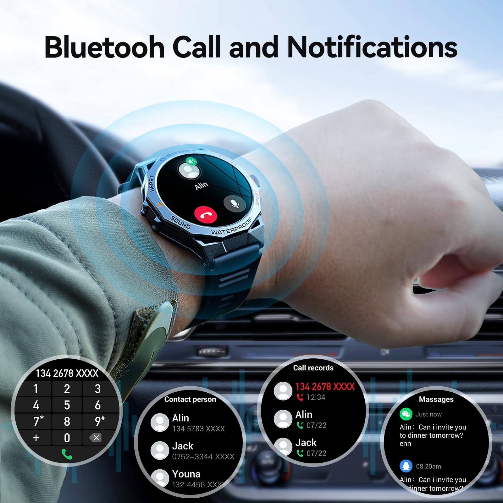,1.43" Amoled for Android Phones,10ATM Waterproof with Bluetooth (Answer/Dial Calls) Ultra Long Battery Life,100+ Sports Modes ⌚【1.43'' AMOLED Always-on Display】The durable for men features a high-resolution 1.43'' AMOLED touchscreen with a resolution of 466*466. This touhscreen not only provides clear content display, smooth operation, and visual experiences but also enables the use of an extremely energy-efficient Always-On Display function, where the screen remains constantly on. ⌚【Rugged Military 】- military for men is designed in outdoor tactical style with exquisite craftsmanship,the men's has been tested by dozens of standards such as extreme temperatures, low pressure, dustproof, and so on, and its unique combination of composite material and military-metal case ensures the 's durability and functionality. ⌚【Bluetooth Calling & Notifications】This men's is equipped with a high-quality speaker and microphone for clearer sound and smoother calls. The can receive calls, messages, and notifications from applications such as Facebook, WhatsApp, Twitter, , and more. Each time a notification is received, the vibrates to alert you, ensuring you don't miss any important calls or messages. ⌚【Multifunction and Broad Compatibility】- for men also offers many useful features such as a calculator function, weather forecast, music player, stopwatch, alarm clock, etc.Bluetooth is with cell phones with Android 4.4 and IOS 8.0 and above. ⌚【Fitness Tracker with 100+ Sports Modes】fitness supports 100+ sports modes, including walking, running, basketball, soccer, cycling, hiking, and more. There are 100+ exercise options in the FitCloudPro app that you can choose and replace on the . Men's sports will automatically and accurately record your exercise data such as steps, calories, distance, and activity time to help you exercise scientifically. Set an exercise goal for yourself and work hard to achieve it.