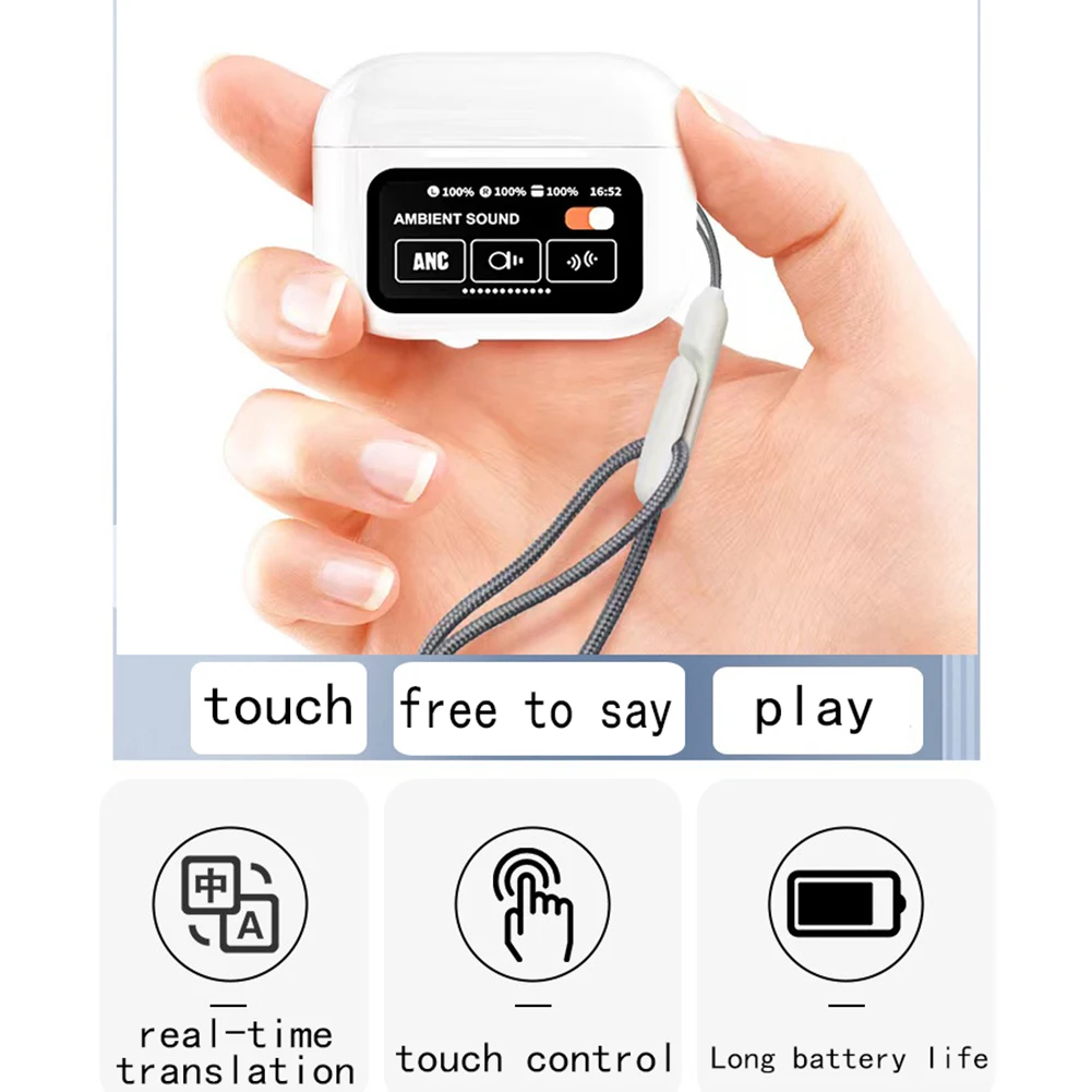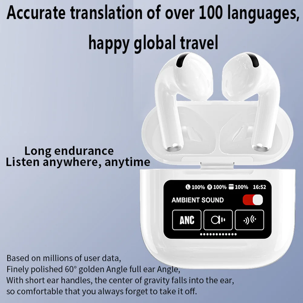 144 Languages Intelligent Translate Earbuds ANC Noise Cancelling AI Real Time Translation Earbuds Bluetooth-Compatible 5.4 Smart Voice Translator 99% Accuracy Ideal for Travel and Business Feature: 1. High-Precision Intelligent Translate Earbuds: Experience real-time translation in 144 languages with an impressive 99% accuracy. These intelligent translate earbuds offer three modes: touch, speaker, and free talk, making communication seamless across the globe. 2. Crystal Clear Translator Earbuds: Equipped with the latest directional audio technology, these translator earbuds ensure clear communication during calls. Enjoy customizable sound settings for an immersive listening experience tailored to your preferences. 3. Reliable Real Time Translation Earbuds: Featuring Bluetooth-Compatible 5.4, these real time translation earbuds provide quick, stable connections with low power consumption. The smart LED display keeps you informed of battery status, ensuring uninterrupted music and calls. 4. Ergonomic Translation Earphone Design: Crafted with ergonomic precision, these translation earphones offer a comfortable fit for extended wear. Their sleek design makes them the perfect travel companion for anyone on the go. 5. Long-Lasting Translator Device Battery: Enjoy up to 5-6 hours of listening on a single charge with this translator device. With a quick 1-2 hour recharge, it's ideal for long journeys or extended use, ensuring seamless communication all day. Specification: Origin: Mainland China Color: White Chip: Jerry 6983D4 Version: 5.4 (Binaural Call) Working frequency: 2.402-2.480GHz, Supported protocols: A2DP/AVRCP/HFP/HID/AVCTP /AVDTP, and SPP Transmission distance: 15M (Barrier-free) Response frequency: 20-20000Hz Speaker unit: diameter F13 copper ring speaker, 5mW Microphone: round microphone/silicon microphone Charging input standard: contact, DC4.75-5.25V/600MAH Battery type: 3.7V polymer battery 300mAH, headphone battery 25mah Charging time: 1h Charging compartment size: 50x46.2x21.4mm/1.97x1.82x0.84inch Packaging size: 99*99*33mm Single product bare weight: 43g Single product with packaging weight: 120g Note: Due to different monitor settings and lighting conditions, the actual color of the item may vary slightly from the pictures. Thanks for your understanding! Please allow a 1-2 cm difference in measurements due to manual measuring. 2 X Earphones 1 X Lanyard 1 X Charging Case 1 X Charging Cable 1 X Instruction Manual