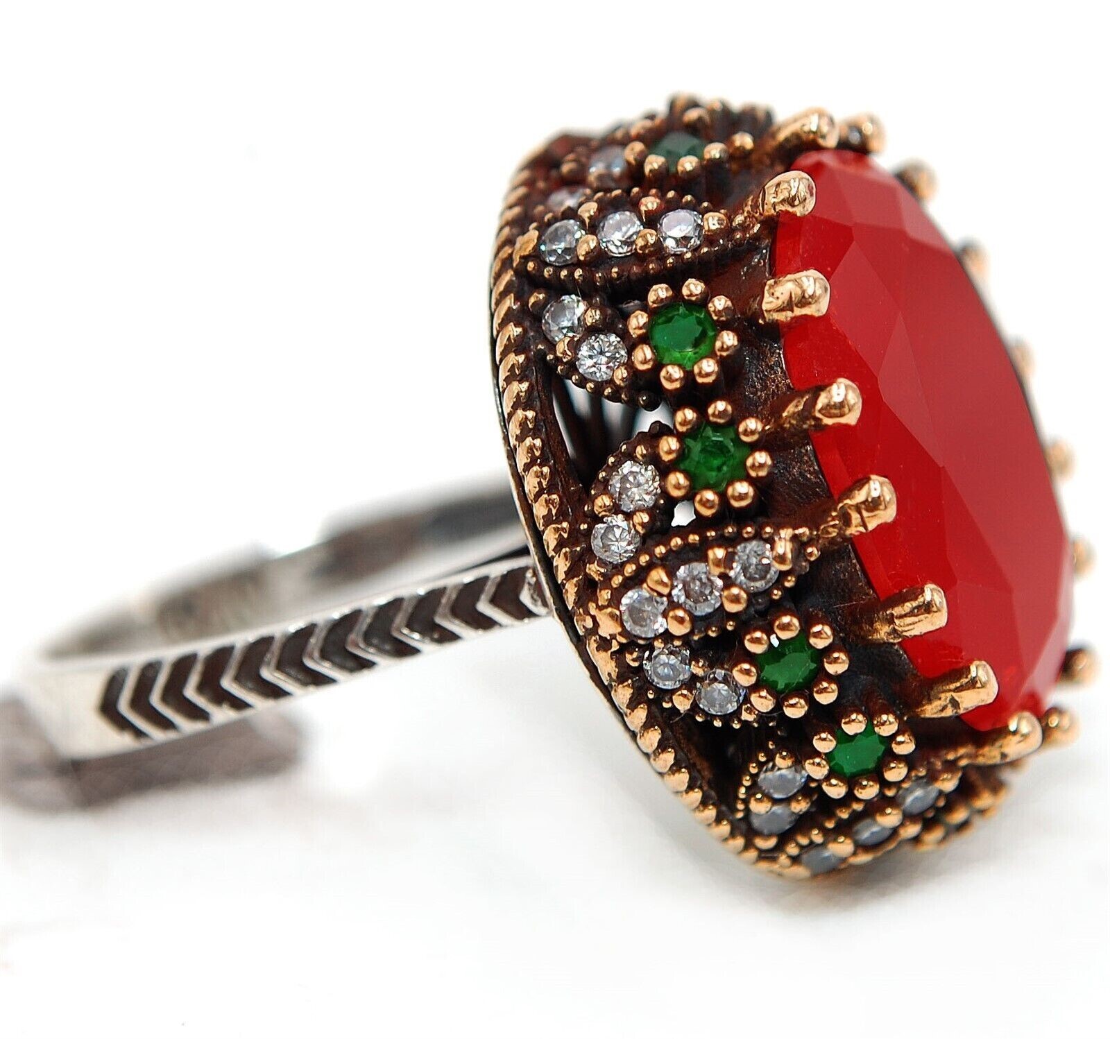 Menu Store FAQ Payment Shipping returns Feedback CONTACT US SHOP BY RING SIZE 4 4.5 5 5.5 6 6.5 7 7.5 8 8.5 9 9.5 10 10.5 11 11.5 All STORE CATEGORIES 99 cent daily deals Auctions Ending Soon New Arrivals Buy it now Rings Pendants Earrings Necklace Bangles & Bracelets POPULAR STONES Aquamarine Ruby Sapphire Pink Sapphire NATURAL GREEN SAPPHIRE Topaz Opal Pearl Amethyst Blue Topaz Kunzite Herkimer Diamond Hand Carved Fossils Citrine Garnet Alexandrite Natural Rough Two-Tone Sterling Silver Store Newsletter Add old-english-silver to your Favorites and receive our e-mail newsletters about new items and special promotions. General Interest Sign Up Gemstone : TREATED RUBY & WHITE TOPAZ, GREEN TOURMALINE Metal : Genuine 925 Solid Sterling Silver Total Carat Wt : 14 Total Gram Wt : 8 Dimensions : 1" Long Ring Sz : 8 Shipping & Handling