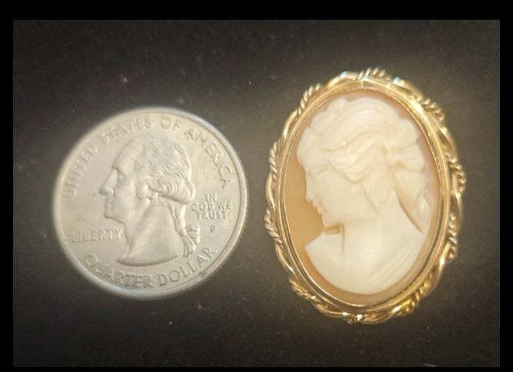 Collectors call these cameos "The Beauties" handcrafted by the New York based Winard Company which strove to create "lovely and elegant" cameos. The facial features of this cameo successfully fulfills their goal of beauty. This hand carved pendant is a vintage natural shell cameo pendant/brooch from the 1940s/1950s era. Condition: This pendant functions as both a brooch and a pendant, the brooch pin opening and closing perfectly (See Photo)and the pendant loop intact. Condition is Pre-owned: There are scratches but appear to be initials deliberately carved? No other marks or damage seen. Measurements in pictures. Hallmark is Winard 1/20 14K GF. Pendant is GOLD FILLED. Shipping paid Velvet gift box
