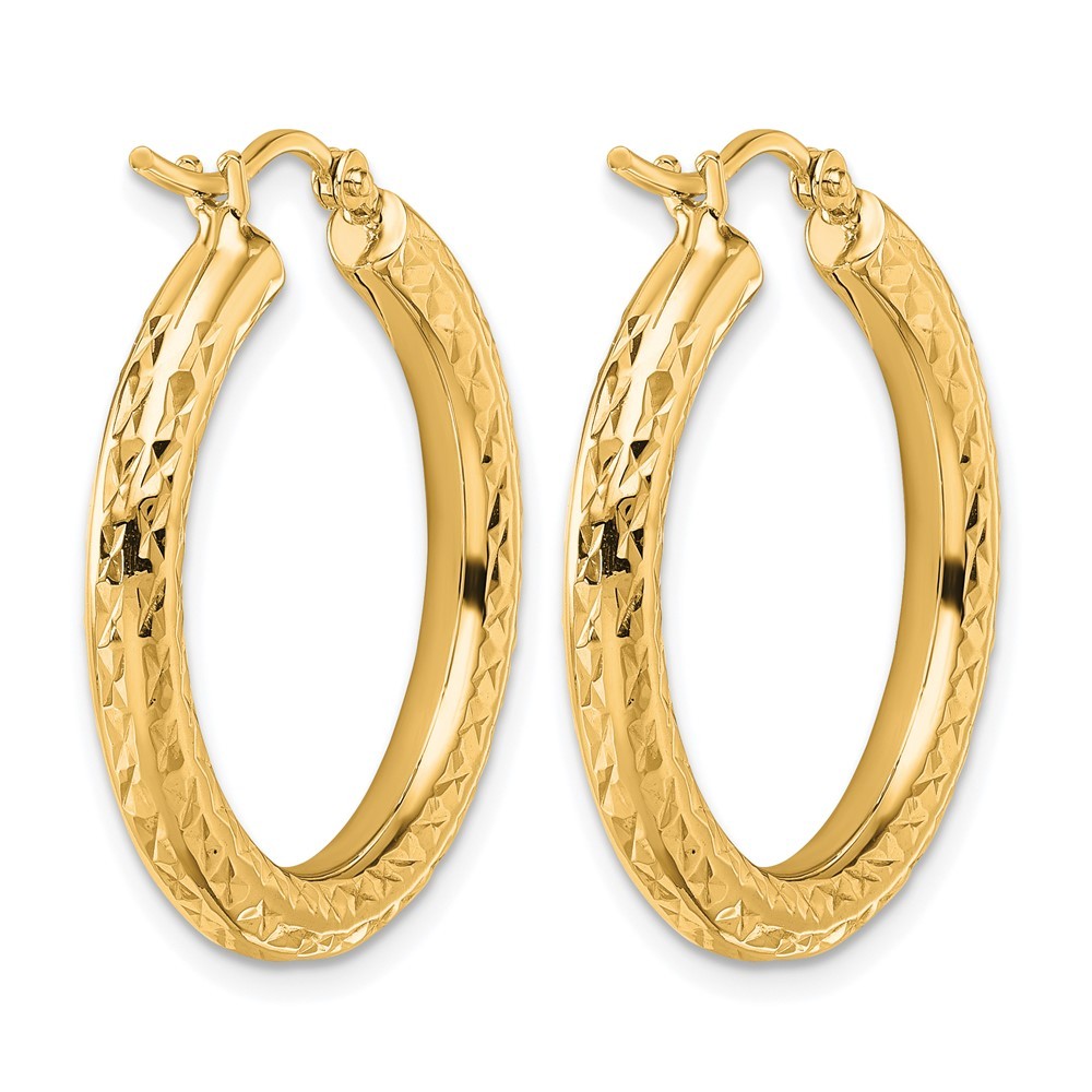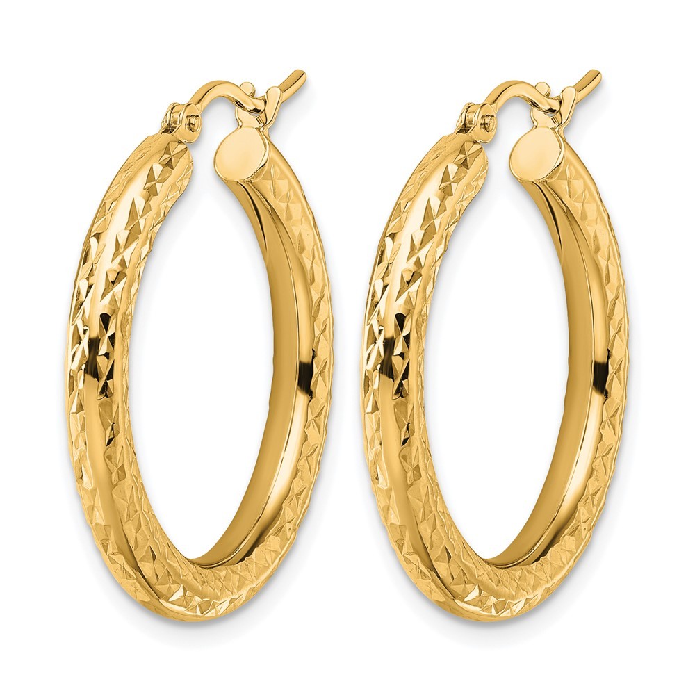 Material: Primary - Purity:14K|Finish:Polished|Length of Item:25 mm|Material: Primary:Gold|Thickness:3 mm|Warranty:Lifetime Guarantee|Item Weight U/M:gm|Width of Item:25 mm|Product Type:Jewelry|Jewelry Type:Earrings|Sold By Unit:Pair|Gender:Women's|Texture:Diamond-cut|Material: Primary - Color:Yellow|Earring Closure:Wire & Clutch|Earring Type:Hoop All weights and measurements are approximate and may vary slightly from the listed information. Welcome to diamond_6720 Payments We accept all Ebay approved payment. Please sent the payment to us within 8 days after the auction has ended, or you will have unpaid case auto open by eBay. Shipping Policy We will ship all items within 1 business days of purchase during the work week (M-F) excluding holidays. If you order on Friday, your order will be shipped the following business day. Tracking will be provided when it becomes available. We will only ship to a PayPal Verified Address. Please make sure your address is current and correct. If the information does not match, your order may be canceled. Buyers are responsible for all customs, duties and taxes for your respective countries. Delivery times for International Shipping will vary. California Buyers Pay 9.0% Tax on all orders. case auto open by eBay. Return Policy & Exchange Returns or Exchange are accepted. Buyer must contact us within 30 days after the item is received. Item must be returned in unworn and resalable condition. We will only issue a refund for the purchase price, excluding any shipping fees. If we are at fault, we will provide a full refund. Buyer is responsible for all return shipping costs. BUYERS FEEDBACK If you have any concerns regarding your purchase, please contact us via eBay Message, we assure you that a satisfactory resolution will be reached. Your feedback is very important to us Do remember to give us 5 star rating(*****) if you are satisfied with our product & service .