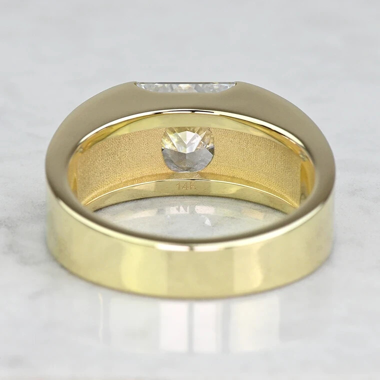 WELCOME TO HARRY GEMSTONES Elevate your style with this exquisite 14K Yellow Gold Plated Princess Cut D/VVS1 Moissanite Half Bezel Set Men's Ring. Crafted to perfection, this ring features a stunning white princess cut moissanite stone, measuring 8mm in length and width, showcasing excellent cut grade and VVS1 clarity grade. The half bezel setting style adds a touch of sophistication and elegance to this band, making it an ideal choice for engagement and wedding occasions. This band is made of high-quality 925 sterling silver, and it is completely plated with yellow gold, providing a luxurious look and feel. The ring size is 7, and it is customizable as per your preferences. The band is also available in a rectangle shape, adding more variety to your jewelry collection. Get this IGLA certified ring for a fair price, and enjoy the timeless beauty it brings to your everyday look.