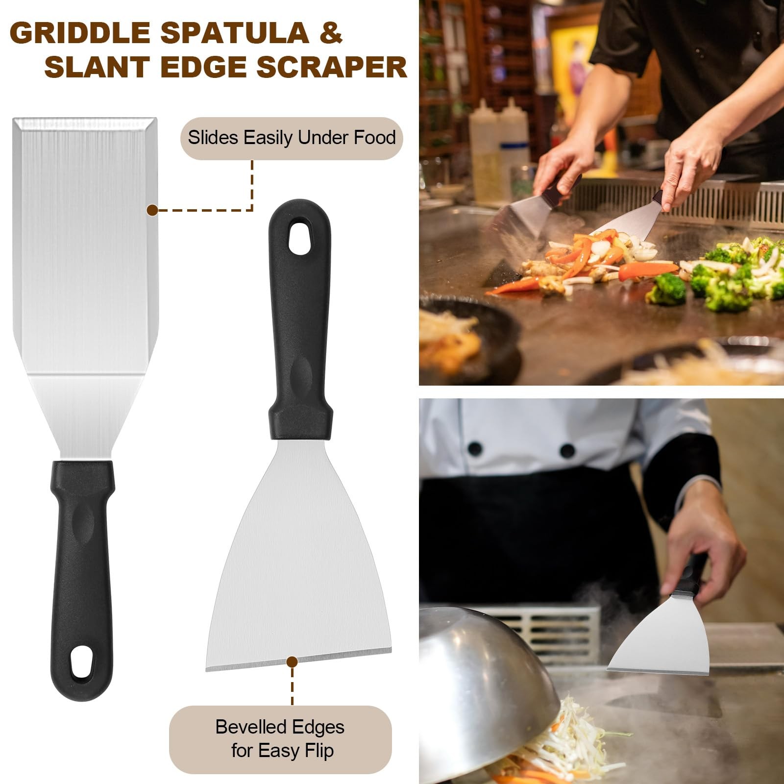 Griddle Accessories Set of 14, Flat Top Grill Accessories Set for Blackstone and Camp Chef 【Perfect 14pcs BBQ Accessories】This griddle accessories kit includes: 1* long slotted spatula, 1* long griddle spatula, 1* small spatula, 1* slant edge scraper, 1* chopper, 1* cleaning brush, 1* sauce brush, 2* egg rings, 2* squeeze bottles, 1* grill tongs, 1* storage bag, 1* gift box. 【Premium Stainless Steel】Compared with other stainless steel on the market, Our metal flat top grill is made of high quality stainless steel, heat-resistant and rust-proof, safer and more durable. So you can easy enjoy your grilling, camping or cooking without worry about your tools bending, breaking or rusting again, which is BPA free you can use it with confidence. 【Easy to Clean & Storage & Carry】Our griddle tool kit is dishwasher safe, or easily wash by hand with water and soap, so you can enjoy a delicious barbecue with your family without hassle. Each tool can be placed in an orderly manner and better protected in the compact storage bag. Convenient hangers are provided for easy storage and food grade grill tools are easily cleaned with warm, soapy water. Note: After washing the spatula and scraper, please make sure to dry them to avoid rust. 【Chef's Choice griddle accessories kit】This grill tools set with griddle scraper, spatulas and oil bottles helps you to grill as easily as a restaurant chef. Great for flipping burgers, pancakes, veggies, cutting bread,meat and sausage, scraper & chopper to dice food and scrape griddles clean. The Long Griddle Spatula can move large amounts of food quickly and accurately. Egg rings and pepper shakers to enhance your griddle cooking experience. 【Great Gift Choice】This practical barbecue tools set with beautifully designed gift box is ideal gift choice for Fathers Day, Thanksgiving or Christmas. It includes all the tools needed for yard, outdoor, and camping barbecues an ideal gift for friends, lovers, or family members who love cooking or barbecue and camping enthusiast.