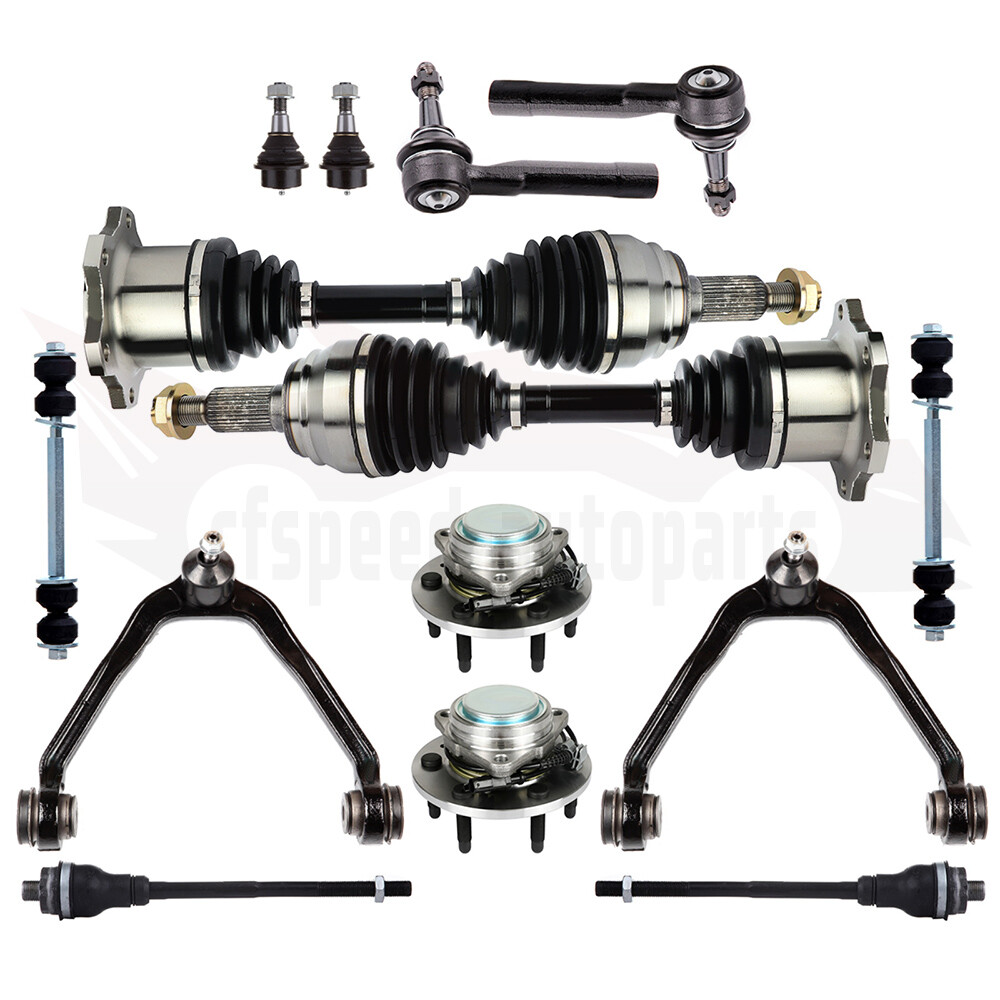 1.Notes (1).Please check the fitment chart above before payment making sure all the suspension parts listed on this page are compatible with your automobile. (2).Please refer to Moog official website before narrowing down your search so as to avoid unnecessary item not as described return requests. (3).Please contact our customer services for targeted discount after all the items are received if you have reached any targeted discount thresholds, the terms of which is at the bottom of this page. 2.Fits These Vehicles Cfspeed-autoparts 14X Control Arm Tie Rod End with Wheel Hub Bearing CV Axle Shaft For Tahoe Yukon 1.Notes (1).Please check the fitment chart above before payment making sure all the suspension parts listed on this page are compatible with your automobile. (2).Please refer to Moog official website before narrowing down your search so as to avoid unnecessary item not as described return requests. (3).Please contact our customer services for targeted discount after all the items are received if you have reached any targeted discount thresholds, the terms of which is at the bottom of this page. 2. Fits These Vehicles 2002-2006 Cadillac Escalade 2003-2006 Cadillac Escalade ESV 2002-2006 Cadillac Escalade EXT 2002-2006 Chevrolet Avalanche 1500 1999-2006 Chevrolet Silverado 1500 2000-2006 Chevrolet Suburban 1500 2001-2006 Chevrolet Tahoe 1999-2006 GMC Sierra 1500 2000-2006 GMC Yukon 2000-2006 GMC Yukon XL 1500 3.Package Includes 2x Wheel Hub Bearing -515036F 2x Front Inner Tie Rod End -ES3488 2x Front Sway Bar End Link -K80631 2x Front Lower Ball Joint -K6541 2x Front Outer Tie Rod End -ES3493T 2x Front Upper Control Arm And Ball Joint -K80942 2x CV Axle Shaft -60-1009 Ball Joint Replacement Guideline: If there is a knocking or clunking noise in the area of the front axle when the car is traveling over road bumps, potholes or curbs, then there is usually a defect in a component of the wheel suspension. Picture(A) The side of the front axle from which the (vibration) noise is emanating can already be determined during a test drive. The type of noise also already provides certain indications for maintenance regarding which components might be faulty. Picture(B) 1.Raise the vehicle and remove the front wheels. 2.To loosen the fastening screws and fixing nuts of the compression ball joint more easily, spray them with rust remover and allow to act for a few minutes. Picture(C) 3.Loosen the fastening screws of the broken ball joint on the control arm and remove the nuts. Picture(D) 4.Loosen and remove the fixing nut of the ball joint on the steering knuckle. Tip:If the ball stud rotates, hold the ball stud in place with a hexagon socket. Picture(E) 5.Remove the bad or worn ball joint from the control arm. 6.Loosen the compression ball joint on the steering knuckle using a suitable special tool. Picture(F) 7.Clean the cone connection. Tip:For better sealing and durability of the ball joint sleeve, a little silicone grease can be applied to the contact surface. Picture(G) 8.Insert new compression ball joint in the control arm and steering knuckle and tighten with new fixing nuts. 9.Reinstall front wheels. Lower the vehicle and tighten the wheel studs to the tightening torque specified by the vehicle manufacturer. 10.Measure the chassis and adjust it using the various holes on the compression ball joint if necessary. 11.Finally, carry out a test drive. Sway Bar Stabilizer Link Replacement Guideline: While driving, the following signs may indicate a faulty sway bar stabilizer link: (1).Rattling and thumping noises on rough roads. (2).Imprecise vehicle handling. (3).Stronger inclination of the vehicle during cornering. If the sway bar stabilizer link is found to be defective, it should be replaced as described below. Picture(A) 1.Raise vehicle and remove front wheels. Tip:Always check both stabilizer links and replace them in pairs if necessary. 2.Spray fastening nuts of the stabilizer link with rust remover and let act for a few minutes. Picture(B) 3.Loosen the lower fastening nut of the stabilizer link at the stabilizer and remove. Tip:If the ball stud also starts to turn, hold it with a suitable tool. 4.Press stabilizer link out of torsion bar. Picture(C) 5.Loosen the upper fastening nut of the stabilizer link at the suspension strut and remove it. Tip:If the ball stud also starts to turn, hold it with a suitable tool. Picture(D) 6.Press stabilizer link at suspension strut out of bracket. Picture(E) 7.Insert new stabilizer link at suspension strut. Picture(F) 8.Tighten stabilizer link at suspension strut to the tightening torque specified by the vehicle manufacturer. Tip:Secure the ball stud against twisting with a suitable tool. Picture(G) 9.Insert new stabilizer link at stabilizer. 10.Tighten stabilizer link at stabilizer to the tightening torque specified by the vehicle manufacturer. Tip:Secure the ball stud against twisting with a suitable tool. Picture(H) 11.Remount the front wheels. Lower the vehicle and tighten the wheel studs to the tightening torque specified by the vehicle manufacturer. Tip:Even if replacing the stabilizer link does not directly affect the chassis setting, we recommend checking the axle setting and adjusting if necessary after working on the suspension. 12.Conclude with a test drive. Tie-Rod End Replacement Guideline: If you feel a bump in the steering when driving over road bumps or curbs, this might be due to worn tie rod ends or inner tie rods. Clicking noises during sudden steering movements can also be symptoms of a defective tie rod. In order to determine the exact cause and replace the defective tie rod, the car must be elevated with a vehicle lift in order to be examined more closely. This useful tip applies to the exchange of tie rod ends and inner tie rods, which together form the so-called tie rod. Picture(A) Note: Cleanliness is extremely important when working on the power steering. Incorrect work and contamination can lead to leakage and, in the wor