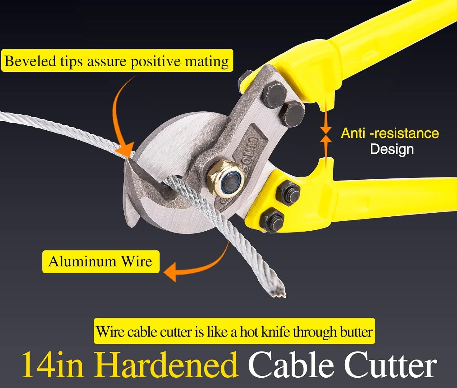 14in Hardened Cable Cutter Wire Rope Cable Cutter, Heavy Duty Wire Cutter for Aluminum Copper Wire Up to 1125mm² - Cable Wire Cutter Heavy Duty Stainless Steel High Quality 14in Hardened Cable Cutter This heavy duty cable cutter is made of hardened steel. PVC non -sliding handle to ensure better and more stable grip. High Leverage Cable Cutter A longer handle would give better leverage. This labor-saving design conforms to ergonomics, helps to save most of the effort, effectively prevents hand fatigue, which also makes the work become easier. Sharp Cutting Blades Durable cutting edge make a very clean and precise cut, no frays. Precise cutting action is as easy as cutting butter with a hot knife. FEATURE The arc-shaped jaw can prevent the cable from sliding during shearing. Knife and anvil style cutting edge to ensure perfect mating and superior cutting edge life. Widely Used Widely used for aluminum, copper, communications cable. Being a truck driver, this is a perfect tool if you have to break a cable seal when making a delivery. Specification: Cutting Range : For Aluminum Copper Wire Up to 125mm2 Length : 14Inch Material: Hardened Steel Weight: 2.2 pounds Size: 10 inch Package Include: 1 x 14in Hardened Cable Cutter NOTE Any type of steel will damage the blades. This is meant for soft copper and aluminum wire only. Clean Cut: Experience flawless cuts every time with our razor-sharp, heat-forged blade that slices through cables like butter! Say goodbye to frayed ends—this cable cutter delivers clean, exact cuts thanks to beveled tips and a rugged bolt-pin system that maintains perfect blade tension. Perfect for professionals who demand precision Heavy Duty Wire Rope Cutter: This 14-inch wire cable cutter is forged from hardened steel, with high hardness, good toughness, sharp cutting, unmatched strength and longevity. The non-slip PVC handle ensures a rock-solid grip, reducing hand strain while tackling heavy-duty tasks Effortless High-Leverage Design: Give your hands a break! Our ergonomic, extra-long handle multiplies your cutting power, making even the thickest cables (up to 3/8" diameter) feel effortless. Lightweight yet robust, steel wire cutter slips easily into tool belts—perfect for electricians, contractors, or DIYers who value efficiency and comfort Widely Used: Cuts copper and aluminum wires up to 125mm² with ease—Perfect for electrical work, automotive projects, and HVAC systems. Note: Avoid steel cables to protect blade integrity. Compact and portable, stainless steel wire cutter is your go-to tool for on-site jobs or workshop precision Warranty: Backed by a 3-month hassle-free warranty and dedicated customer service, your satisfaction is guaranteed. Portable wire rope cutter, easy to storage and transport. If you have any issues with our 14inch hardened cable cutter, simply contact us for troubleshooting help. Thank you