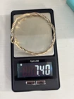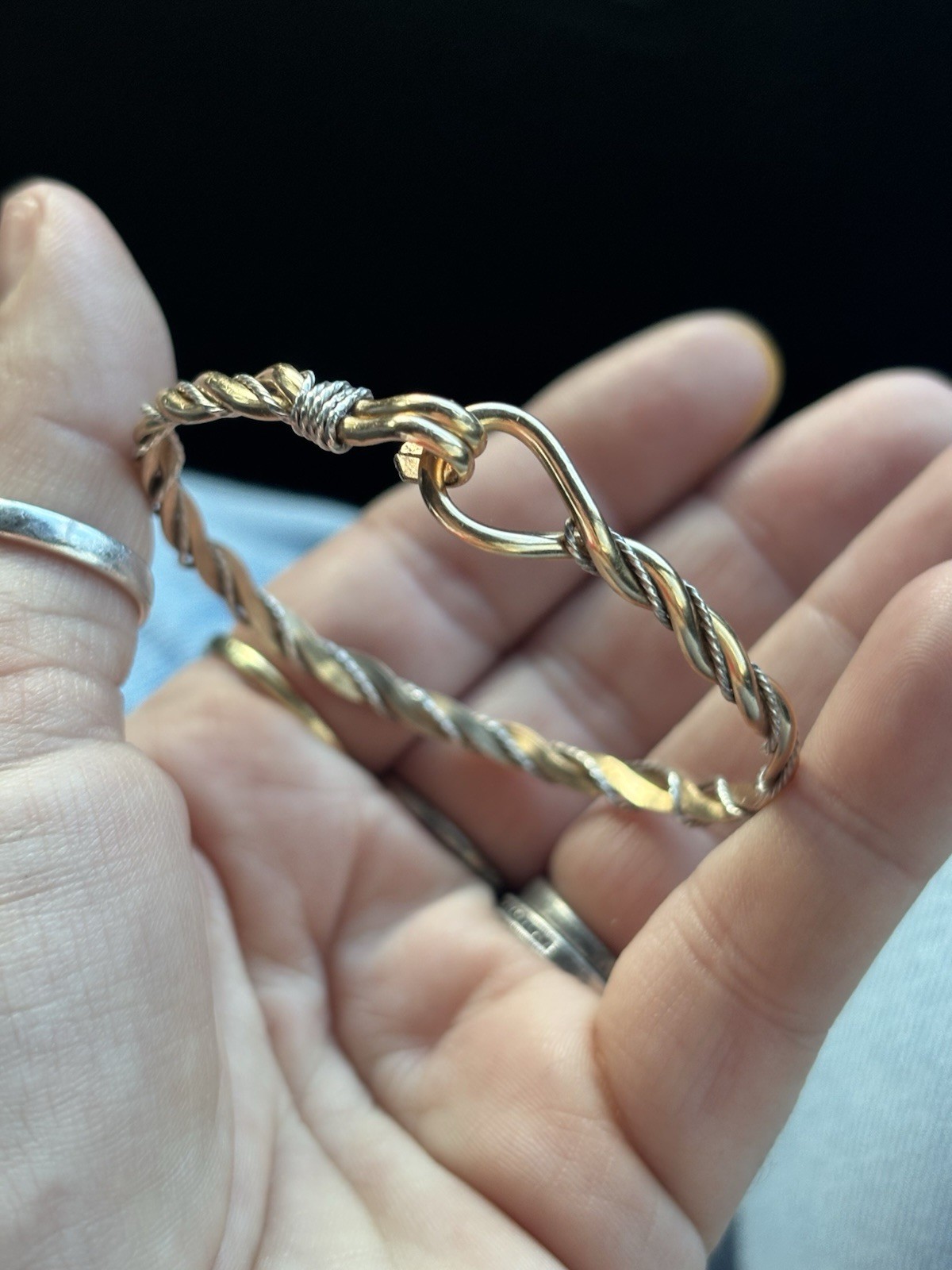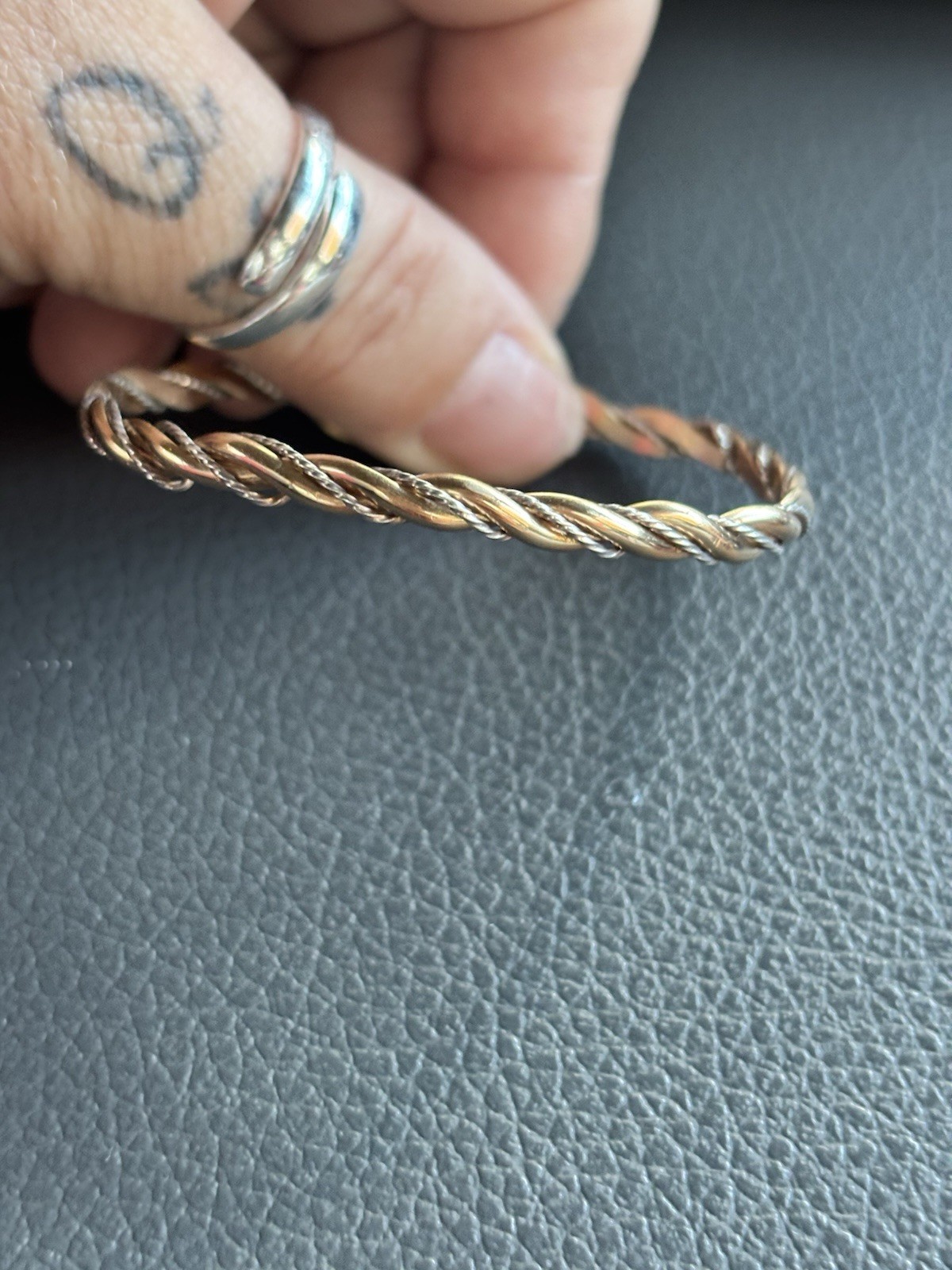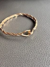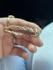 Solid 14k yellow gold with silver wire wrapped around it! It is adjustable by bending it! It is slightly bent now but you can’t tell while wearing it at all. It looks very nice on! I tested the gold myself with acid and it’s definitely 14k gold! It is an estate find. Such a stunning piece for sure! Weight is 7.40 grams. Approximately 2.5” diameter but can stretch some Priority shipping