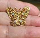 Showcase your unique style with this stunning 14k yellow gold butterfly brooch. The brooch features eight beautiful natural opals in a round shape. The butterfly design symbolizes elegance and grace, making it an ideal accessory for any occasion. This vintage brooch is signed and crafted with the highest quality standards. The prong setting style enhances the beauty of the opals, making it a perfect addition to your fine jewelry collection. Whether you're a fan of animals and insects or simply love multicolor gemstones, this brooch is a must-have. Add it to your collection today and make a statement wherever you go!