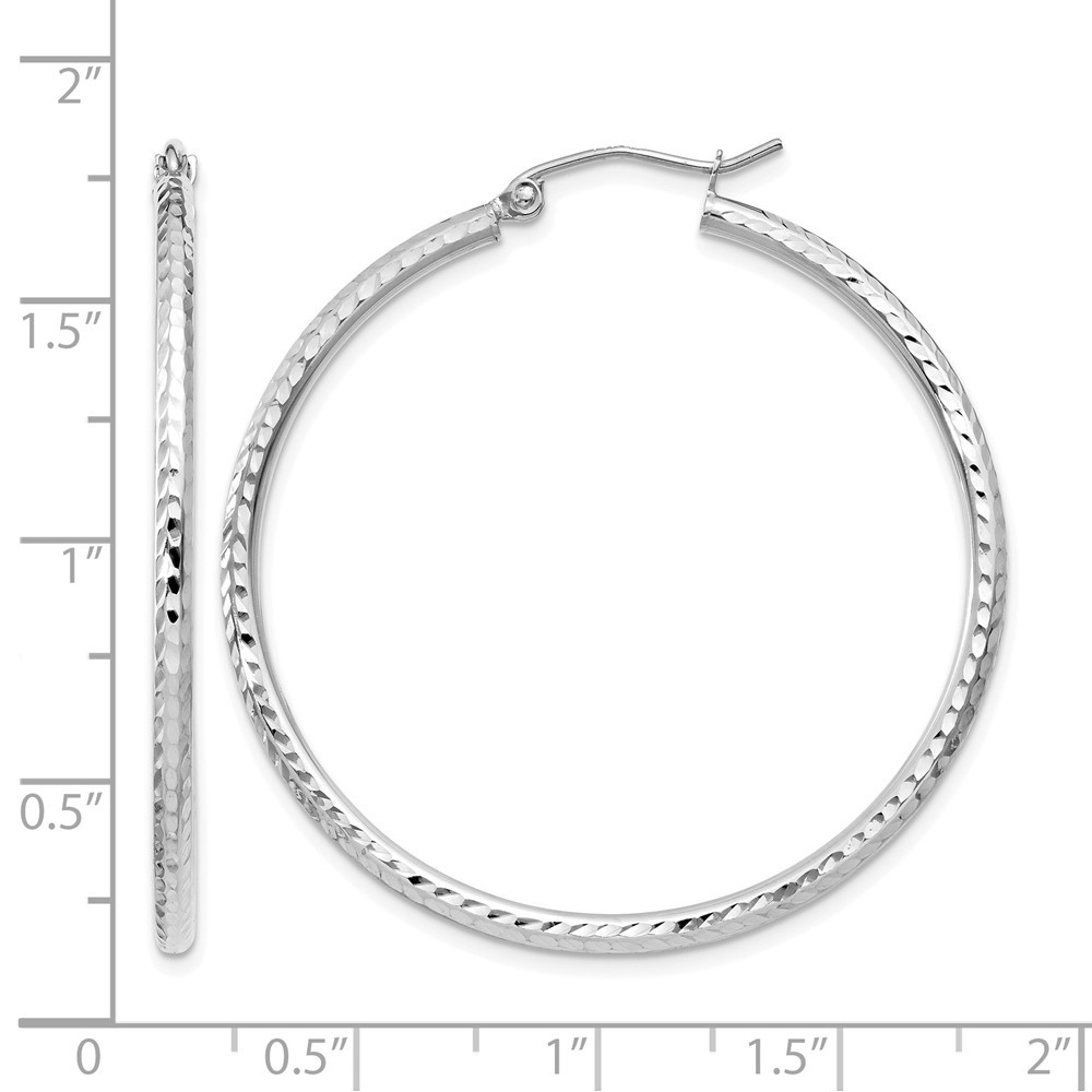 Material: Primary - Purity:14K|Finish:Polished|Length of Item:40 mm|Plating:Rhodium|Material: Primary:Gold|Thickness:2 mm|Warranty:Lifetime Guarantee|Item Weight U/M:gm|Width of Item:40 mm|Product Type:Jewelry|Jewelry Type:Earrings|Sold By Unit:Pair|Gender:Women's|Texture:Diamond-cut|Material: Primary - Color:White|Earring Closure:Wire & Clutch|Earring Type:Hoop All weights and measurements are approximate and may vary slightly from the listed information. Welcome to diamond_6720 Payments We accept all Ebay approved payment. Please sent the payment to us within 8 days after the auction has ended, or you will have unpaid case auto open by eBay. Shipping Policy We will ship all items within 1 business days of purchase during the work week (M-F) excluding holidays. If you order on Friday, your order will be shipped the following business day. Tracking will be provided when it becomes available. We will only ship to a PayPal Verified Address. Please make sure your address is current and correct. If the information does not match, your order may be canceled. Buyers are responsible for all customs, duties and taxes for your respective countries. Delivery times for International Shipping will vary. California Buyers Pay 9.0% Tax on all orders. case auto open by eBay. Return Policy & Exchange Returns or Exchange are accepted. Buyer must contact us within 30 days after the item is received. Item must be returned in unworn and resalable condition. We will only issue a refund for the purchase price, excluding any shipping fees. If we are at fault, we will provide a full refund. Buyer is responsible for all return shipping costs. BUYERS FEEDBACK If you have any concerns regarding your purchase, please contact us via eBay Message, we assure you that a satisfactory resolution will be reached. Your feedback is very important to us Do remember to give us 5 star rating(*****) if you are satisfied with our product & service .
