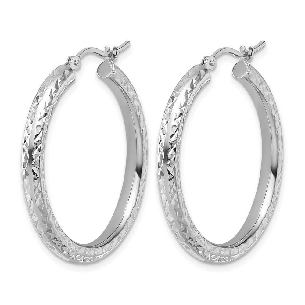 Material: Primary - Purity:14K|Finish:Polished|Length of Item:30 mm|Plating:Rhodium|Material: Primary:Gold|Thickness:3 mm|Warranty:Lifetime Guarantee|Item Weight U/M:gm|Width of Item:30 mm|Product Type:Jewelry|Jewelry Type:Earrings|Sold By Unit:Pair|Gender:Women's|Texture:Diamond-cut|Material: Primary - Color:White|Earring Closure:Wire & Clutch|Earring Type:Hoop All weights and measurements are approximate and may vary slightly from the listed information. Welcome to diamond_6720 Payments We accept all Ebay approved payment. Please sent the payment to us within 8 days after the auction has ended, or you will have unpaid case auto open by eBay. Shipping Policy We will ship all items within 1 business days of purchase during the work week (M-F) excluding holidays. If you order on Friday, your order will be shipped the following business day. Tracking will be provided when it becomes available. We will only ship to a PayPal Verified Address. Please make sure your address is current and correct. If the information does not match, your order may be canceled. Buyers are responsible for all customs, duties and taxes for your respective countries. Delivery times for International Shipping will vary. California Buyers Pay 9.0% Tax on all orders. case auto open by eBay. Return Policy & Exchange Returns or Exchange are accepted. Buyer must contact us within 30 days after the item is received. Item must be returned in unworn and resalable condition. We will only issue a refund for the purchase price, excluding any shipping fees. If we are at fault, we will provide a full refund. Buyer is responsible for all return shipping costs. BUYERS FEEDBACK If you have any concerns regarding your purchase, please contact us via eBay Message, we assure you that a satisfactory resolution will be reached. Your feedback is very important to us Do remember to give us 5 star rating(*****) if you are satisfied with our product & service .