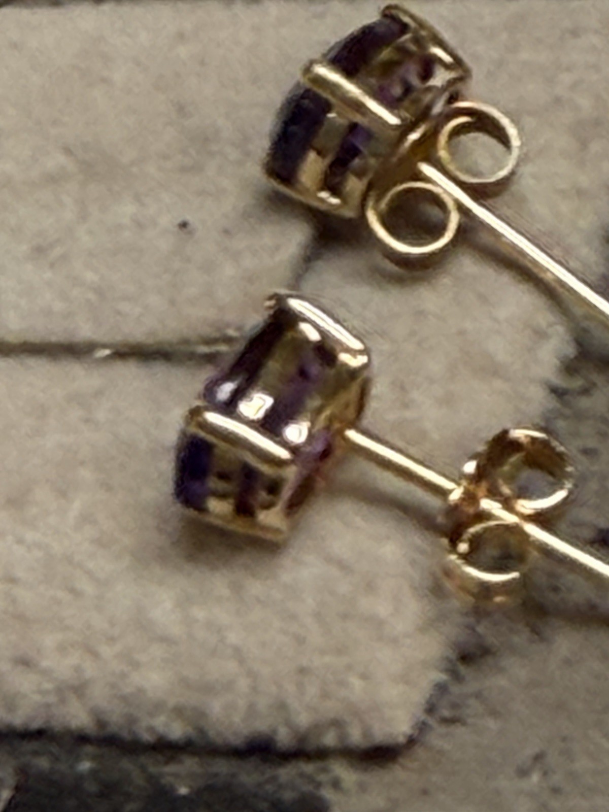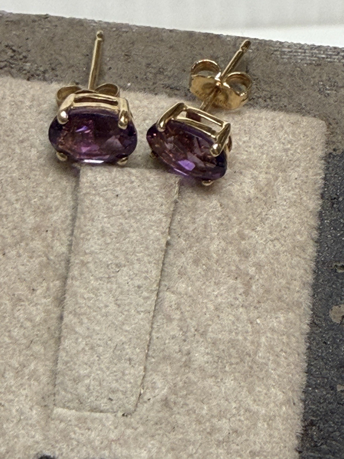 These 14k Yellow Gold Amethyst Stud Earrings feature an oval-shaped amethyst as the main stone, set in a prong setting. The earrings have a butterfly closure and are made of yellow gold with a metal purity of 14k. With a total carat weight of 2, these elegant studs are perfect for adding a pop of purple color to any outfit. The amethyst stones are 0.5mm in width and 0.7mm in length, making them a stylish and sophisticated accessory for any jewelry lover.