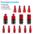 Product Feature ✨Corrosion-Resistant Construction: Crafted from aluminum with a protective coating, these air couplers and plugs are built to withstand heavy-duty use. The robust construction ensures long-lasting performance while offering excellent resistance against rust and corrosion, making them ideal for both indoor and outdoor applications. ✨Secure 6-Ball Locking Mechanism: Designed with a 6-ball locking system, the coupler provides a firm and stable grip on the plug, reducing the risk of accidental disconnections. This safety feature enhances the reliability of your air tools while the pre-coated adhesive threads create a tight seal, preventing air leaks and ensuring efficient airflow. ✨Quick-Connect Design: The lightweight yet sturdy design makes these air hose fittings effortless to handle. Featuring a user-friendly quick-connect mechanism, they allow for swift one-handed operation, enabling you to connect and disconnect air tools with ease—saving both time and effort during tasks. ✨Universal Compatibility: Engineered for versatility, the universal coupler is compatible with I/M, ARO, and T-type air plugs. This adaptability makes it perfect for workshops and job sites where different plug types are in use. Additionally, these air compressor quick-connect fittings are interchangeable with most major manufacturers. ✨Wide Application: Designed for professional and home use, these air hose fittings are suitable for a wide range of pneumatic tools and equipment. Whether for auto repair shops, bodywork shops, construction projects, home garages, or industrial applications, they provide reliable air connections to enhance efficiency and workflow. Product Specification Type Air Hose Fittings Material Aluminum Color Red Connector Type Plug, Coupling Thread Size 1/4 Inch Thread Type NPT Locking Mechanism 6-Ball Locking System Compatibility I/M, ARO, T-Type Air Plugs Applications Auto Repair, Body Shops, Construction, Home Garages, Industrial Use Package Included 🎁6 x Male Plugs 🎁4 x Female Plugs 🎁2 x Male Couplers 🎁2 x Female Couplers Location Descriptions To improve your buying experience and ensure fast delivery, Your order will be shipped from the warehouse located in either new jersey or california that is closest to your address. If you have any questions, Please contact us. Thank you for your support ! On Feb 24, 2025 at 17:56:37 PST, seller added the following information: