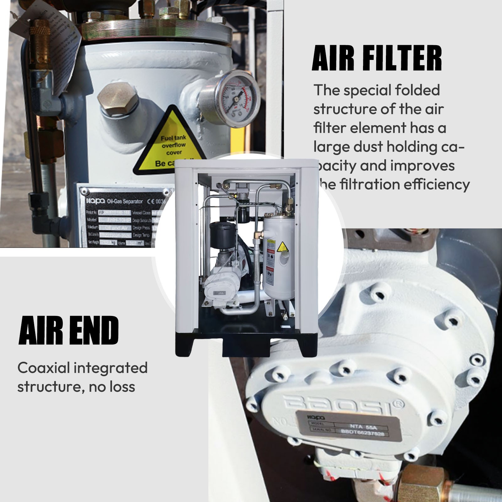 Home Payment Shipping Return Policy About Us Contact Us Feedback Store Categories Three-phase screw compressor VSD Rotary Screw Compressors RotaryScrew CompressorW/Tank Laser Cutting Air Compressor Portable air compressor Large industrial compressor Oil-free screw air compressor AirCompressorReplacementPart Consumables, engine oil Refrigerated air dryer High pressure air compressor Other 15 HP VFD Rotary Screw Air Compressor 120PSI 460V 3 Phase 20.59A 66CFM 15 HP VSD VFD Rotary Screw Air Compressor 120PSI 460V 3 Phase 20.59A 66CFM Power: 11 kW/15HP Exhaust pressure: 116-125psi Exhaust volume: 66CFM Voltage: 460V- 480V / 60Hz / 3Phase Noise level: 68 dB (A) Outlet diameter: RP3/4 Rated speed: 2940 r/min Packing size: 48*33*43 inch Packaging weight: 710 ibs This Compressor Is Suitable for Three-phase Power Only. 🚫 Warning: This Unit Cannot Be Operated with a Single-phase to Three-phase Converter Application range: mold industry, light and heavy industry, mining, hydropower, seaports, engineering construction, oil and gas fields, railways, transportation, auto repair, electronics industry, power industry, machinery industry, petrochemical industry, food industry, printing industry Easy for Maintenance: All components are easily accessible for fast easy maintenance. Annual maintenance operations only include changing the filters and oil at predetermined intervals. Inexpensive parts and oil combine with long operating intervals to deliver significant savings over the life of the machine. Standard Warranty: KAPA products enjoy a 1-year warranty on the entire machine from the date of purchase. We will not provide free repair services for machine damage caused by installation errors, incorrect use, poor oil quality, maintenance errors, and the use of non-original accessories Regular maintenance interval schedule: Every 50 hours or weekly --- Check oil level. --- Check intake filter, if necessary clean it. --- Drain condensation water from oil tank. Every 500 hours --- Check and adjust belt tension if necessary (belt driven only) Every 2000 hours --- Replace lubricants (for mineral lubricants oil) --- Replace oil filter. --- Replace intake filter Every 4000 hours --- Replace lubricants (for synthetic lubricants oil) --- Replace oil separator --- Clean cooler for dirt Brand KAPA Rated Horsepower 15 hp (11 kW) Rated Voltage 460 V, 480V Current Phase 3 Phase MPN Does not apply Airflow Volume (CFM) 66cfm Maximum Pressure 125PSI Air Tank Capacity Tankless Function VSD Motor Horsepower 15 Power Supply Electric