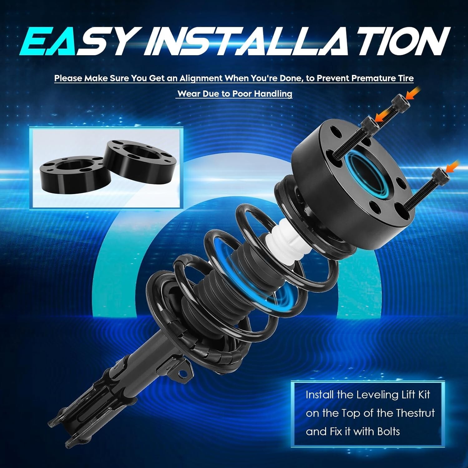 1.5" Front Leveling Lift Kit Compatible with 2003-2017 Ford Expedition, 2004-2023 F150, Raised by 1.5 Inch Front Suspension Strut Spacers for 2006-2008 Lincoln Mark LT, Set of 2 We offer 1-5 Days Free shipping & 30-Days Free returns Vehicle Compatibility: Compatible with 2003-2017 Ford Expedition; 2004-2023 Ford F-150; 2006-2008 Lincoln Mark LT. Lift 1.5 Inch: Please note that the Front Leveling Lift Kit's thickness is less than 1.5 inch because of suspension geometry. The ratio between lift height and kit thickness is not 1:1, but it will lift the truck to a true height of 1.5 inch. An alignment is always recommended after installing. Various Benefits: The Leveling Lift Kit will give a noticeably aggressive look to your vehicle, increases additional fender clearance and provides more tires alternative, allowing larger tires and wheels. Premium Material: ILONPA's Suspension Leveling Kit is forged from 6061-T6 aluminum alloy, CNC automatic processing, surface anodic oxidation and heat treatment, which not only ensures high precision and stability, but also enhances the hardness and corrosion resistance of the material. Easy Installation: No cutting or drilling needed, and you could complete installation with 1-2 hours. Note that you have to make sure to get an alignment when you are done. We offer 1-5 Days Free shipping & 30-Days Free returns