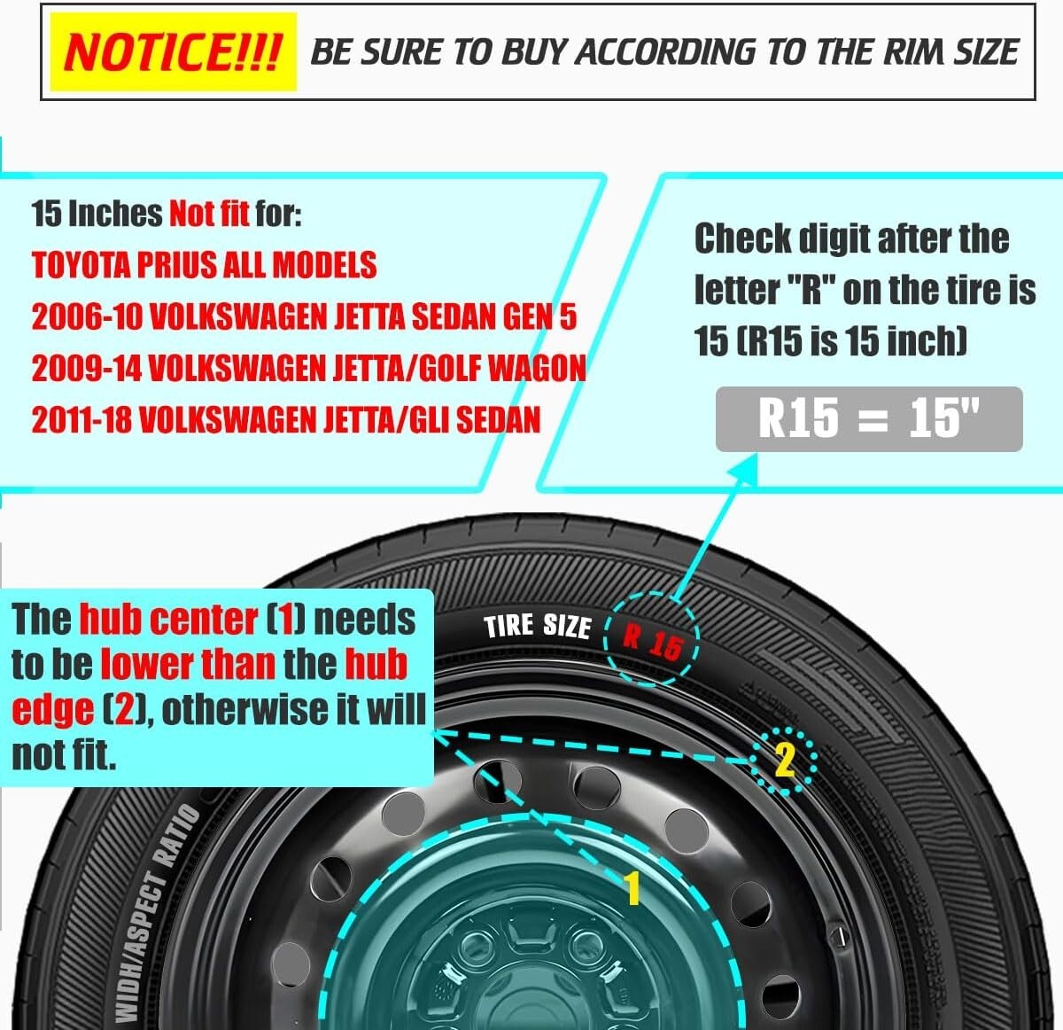 15 Inch Hubcaps Set of 4 Silver Black ABS Wheel Rim Covers Snap On ‹ › ‹ › ‹ › ‹ › ‹ › ‹ › ‹ › ‹ › ‹ › 15 Inch Hubcaps - Set of 4 Elevate your vehicle's aesthetic with our stylish 15 Inch Hubcaps Set of 4 , featuring a stunning silver and black dual-tone design, perfect for various car brands including Toyota, Chevrolet, Dodge, Ford, Honda, Mazda, and Nissan. Features: Fitment Models: Compatible with most vehicle brands; specially designed for iron wheels covers. Please note: Not compatible with Toyota Prius All Models, 2006-10 Volkswagen Jetta Sedan Gen 5, 2009-14 Volkswagen Jetta/Golf Wagon, and 2011-18 Volkswagen Jetta/GLI Sedan. Dual-Tone Silver & Black Finish: Adds a modern and sophisticated flair to your vehicle's look. Durable ABS Material: Crafted from high-quality ABS plastic, ensuring longevity against daily wear, tear, and harsh weather conditions. Easy Snap-On Installation: Designed for effortless installation, simply snap onto the wheel without any special tools required. An adjustable retaining ring guarantees a secure fit. Benefits: Instantly enhances your vehicle’s appearance with a contemporary touch. Constructed from resilient materials to withstand the rigors of the road. Effortless installation process makes upgrading your car's look a breeze. Ensures a secure fit, maintaining the hubcap's position during all driving conditions. Why Choose Our Hubcaps? Designed for the discerning driver, our 15 Inch Hubcaps not only provide exceptional durability but also enhance the look of your vehicle with elegance and style. Don’t settle for bland wheel covers when you can assert your personality through sophisticated design. Transform your ride and make a lasting impression on the road. Order your set of 15 Inch Hubcaps today and experience the perfect fusion of style and functionality! Shipping Free & Fast Shipping - We offer free shipping to most of the USA with a normal delivery time of 3-7 days. However, due to the current situation, additional delivery time (up to 3 weeks) may be required for some items. Alternative Carriers - We may use alternative carriers (e.g. USPS, FedEx, UPS, etc.) to ensure your package arrives safely and on time. Due to the use of multiple carriers, we are unable to provide a tracking number automatically. Handling Time - Orders are processed and shipped within 1-2 business days of receiving cleared payment. Shipping Restrictions - Shipping to Alaska, Hawaii, Puerto Rico, Guam, and other US territories may incur shipping charges or delivery restrictions. Please contact us before ordering, or your order can be refunded/cancelled. State Restrictions - There may be restrictions based on your state of purchase. For example, certain items may not be shipped to California due to state regulations. Contact for Tracking Updates - If you require tracking updates or have any concerns about the delivery of your order, please feel free to contact us, and we will be happy to assist you. Return 30-Day Hassle-Free Returns - We want you to be completely satisfied with your purchase. If you are not, you can return the item within 30 days of receiving it for a full refund or exchange. Easy Return Process - To start a return, simply contact us and we will provide you with a prepaid return shipping label and detailed instructions. Restocking Fee - There are no restocking fees for returns. However, the buyer is responsible for return shipping costs if the return is not due to a seller's error. Refund Processing Time - Refunds will be processed within 5 business days of receiving the returned item in its condition. Payment We accept all major credit cards, PayPal, and Apple Pay for your convenience. Your payment information is secure and encrypted to ensure a safe and seamless transaction. Please complete your payment within 3 days of purchase to avoid any delays in shipping. Feedback Your feedback is extremely important to us. We strive to provide the best products and customer service possible. If you are satisfied with your purchase, please take a moment to leave us a positive review. If you have any concerns or issues with your order, please contact us before leaving negative feedback. We are committed to resolving any problems and ensuring your satisfaction. Contact Us If you have any questions or concerns, please feel free to out to our customer support team. You can contact us through the eBay messaging system. We are available Monday to Friday, 9:00 am to 5:00 pm EST, and we will do our best to respond to your inquiry within 24 hours. Buy it now and enjoy a pleasant shopping experience! Placement on Vehicle: Front,Left,Lower,Rear,Right,Upper Features: Easy to Install,Easy Snap-On Installation,Durable,Stylish Design Material: Plastic,ABS Plastic Finish: Lacquer,Dual-Tone Type: Hub Cap Number in Pack: 4 Compatible Wheel Diameter: 15 in Color: Silver