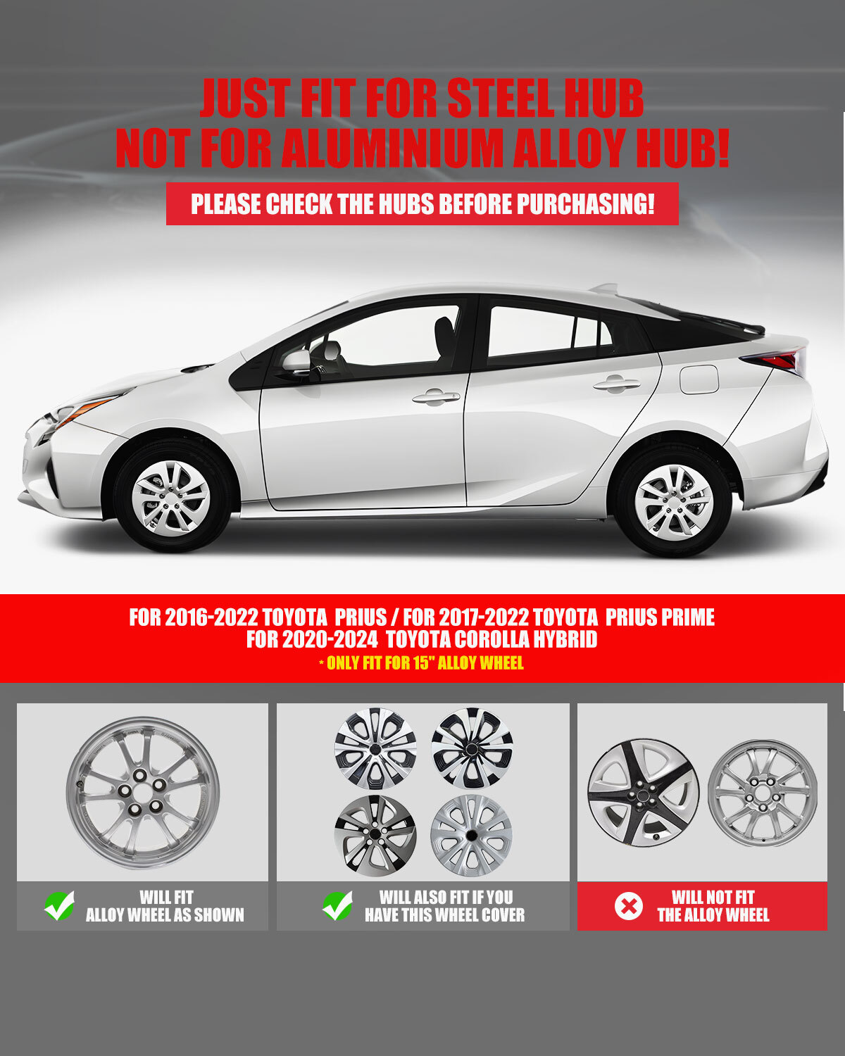 Store Categories Other Car Refrigerator Front Bumper Rear Bumper Fender Flares Inner Fenders Side Steps Running Board A-Pillar Light Mount Brackets Headlights Taillights Fog Lights LED Headlights LED Taillights LED Fog Lights Jeep Chevrolet Ford Toyota Dodge GMC Set of 4 15" Wheel Covers: https://www.ebay.com/itm/405616401986 Wheel Covers Features ✴ PERFECT FIT: This wheel hub cap is specifically designed to perfectly fit for 15-inch wheels, ensuring a seamless match and enhanced aesthetics. It complements the overall design of the vehicle, elevating its visual appeal. ✴ HIGH-QUALITY MATERIAL: Constructed from high-quality materials, this wheel hub cap guarantees durability and longevity. It withstands various road conditions and environmental factors encountered during daily driving, maintaining its pristine condition. ✴ EASY INSTALLATION: Installing this wheel hub cap is a breeze and requires no specialized tools or modifications. It comes with a user-friendly system, allowing for a hassle-free installation process by following the provided instructions. ✴ PROTECTIVE FUNCTION: Besides its aesthetic appeal, this wheel hub cap serves as a protective barrier for the wheels. It prevents scratches and potential damage caused by stones, debris, or other objects, safeguarding the wheel's surface. ✴ AFTER-SALES SERVICE: If There Is a Loss of Product Parts, or Any Parts of The Problem, We Can Provide After-Sales Service, Please Contact Us on The Order Page. Wheel Covers Specification ✴ Type: Hub caps ✴ Number in Pack: 1 ✴ Color: Silver Lacquer & Black Lacquer ✴ Material: PP ✴ Compatible Wheel Diameter: 15 in ✴ Finish: Glossy ✴ Installation Type: Snap-On ✴ Model: For 2016-2022 Toyota Prius/for 2017-2022 Toyota Prius Prime/for 2020-2024 Toyota Corolla Hybrid Wheel Covers Package ✴ 1 Hub cap and 1 retention ring Payment Delivery details Terms of sales About us Contact us Payment We accept PayPal, credit card , Apple Pay & Google Pay etc. Delivery details All items will be shipped within 1-3 business days after payment received, we will try our best to ship out as soon as we can, hope for your understanding. Please double confirm your address and contact information, which will help the delivery faster and more accurately. Note :buyers who purchase international products need to pay import tariffs!!! Terms of sales Professional installation is highly recommended. Any problem of the item please feel free to contact us first , please D o Not leave negative feedback before that, or simply return it within 60 Days in original condition. We will resolve it for you ASAP. About us Any questions please do not hesitate to contact us directly by eBay message . We will reply you within 24 hours asap, thanks for your understanding. Contact us Should you have any problem or require any further information please feel free to contact us . If you are satisfied with our product and service, please kindly leave us a positive feedback. Popular Categories On Apr 29, 2025 at 00:54:19 PDT, seller added the following information: