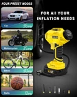 Powerful Cordless Air Compressor: Enjoy the freedom of cordless inflation with our ST189CD Air Pump. Powered by a powerful 20V rechargeable Li-ion battery, it delivers quick and efficient tire inflation. Constructed with a robust metal cylinder and gear, it operates at with a 2x faster inflation speed and +30% more power than regular pumps. With a max pressure of 150psi, it can work continuously for 20 minutes, easily handling four tire inflations at once. Auto Shut Off and Digital Pressure Control: Set your desired air pressure effortlessly by turning the knob—simpler and quicker than button presses. Our air compressor will automatically shut off upon reaching the target pressure, eliminating concerns of overinflation. The clear Digital Pressure Gauge supports 4 unit switches (BAR, KPA, PSI, KG/CM2), ensuring easy and accurate monitoring with an accuracy of +/- 1 PSI for precise inflation every time. Dual Power Assurance: ST189CD tire inflator not only features a 20V rechargeable lithium-ion battery for cordless convenience but also includes a 12V car power adapter, providing a dual power solution for your travels. With the dependable 12V DC adapter as an alternative power source, you don't need to worry about the battery running out during your journey. Versatile Inflation Capability: With a maximum pressure of 150 PSI, our tire inflator is your reliable and versatile companion for various inflation needs. Whether it's your car, motorcycle, bicycle, sports equipment like balls, or even decorative balloons, this portable handheld air pump is designed to handle it all. Please note that it's not suitable for large truck tires. Compact and Portable Design: The Tire Air Compressor features a handheld, portable design that can be easily stored in your car. Your purchase includes a cordless tire inflator, a 20V Lithium-ion battery pack, a 12V car power adapter, a battery charger, 6 nozzles, a user manual, and a tool bag for convenient storage.