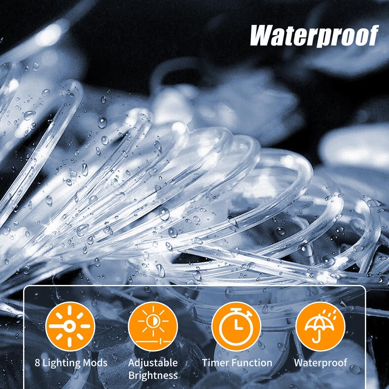 LED String Lights Plug-in, 8 Modes 100 LED Battery Operated String Lights Outdoor Waterproof Fairy PVC Tube Rope Lights with Decor Lighting for Garden Fence Patio Christmas Party Weddings (Cool White) 【Easy to Install】The sturdy yet thin covering makes it easy to wrap the lights around any surface or object. Additionally, our rope lights are lightweight, making them easy to maneuver and install. The lightweight design allows for simple installation using either clear packing tape or clips; 【Malleable PVC Tube Cover】The outdoor rope Light is 78M/256feet copper wire and 1500 LED. Lightweight tube material is wear-resistant and corrosion-resistant, so you don't have to worry about corrosion.The rope wire is bendable and easy to DIY in all kinds of creative ways, Such as snowman or super hero or unique wordings, adding extra fun to your outdoor or indoor events. 【IP65 Waterproof】Our led rope lights are designed to withstand various weather conditions, including rain, wind, snow, and fog, making them an ideal choice for outdoor & indoor decorations. Whether you're hosting a party, celebrating Christmas, Halloween, Thanksgiving, or any other special occasion, our rope lights are a perfect addition to your decor; 【8 Lighting Modes to Create Lots Fun】Gorgeous 8 lighting modes including combination, fireflies flashing, waves, fading, chasing/flashing, fading slowly, twinkle/flashing and steady on, which can create different atmospheres for your life. Flexible wires can easily build the shapes you want; wrap around tree trunks or gazebos;In the darkness, the wires gradually disappear, leaving only bright lights that make your house and garden charming and romantic; 【Widely used indoor and outdoor】: You can wrap these waterproof rope lights around the Christmas tree, around backyard fence, living room, porch columns, camping trailer, put them around your window, door, hallway, and so on.