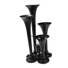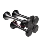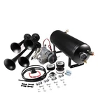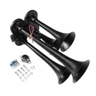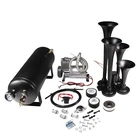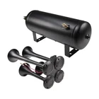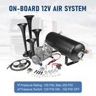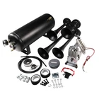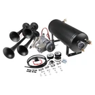 Train Horn Kit 150psi Fits Truck/Car/Semi Loud System /1.5G Air Tank /4 Trumpets Quad Trumpet Train Air Horn (Black), 150 PSI Air Compressor, 1.5 Gallon Air Tank, Thermal Overload Protection, Electric Air Valve, Pressure Gauge, Pressure Switch, Air Hose, Horn Button Air Horn: Quad Trumpet Train Air Horn (Black) Metal Construction 12V Electric Air Valve (Solenoid) with Compression Fitting ¼" OD Nylon Plastic Hose (6 Feet) Mounting Hardware Included Trumpets Total 4 Sound Type Train Construction Metal Mounting Hardware Bracket, Bolts and Nuts Air Compressor Power 12 Volts Color Chrome Maximum Current Draw 20Amp Flow Rate (0 PSI) 1.9 CFM Sealed No 150 PSI Air Compressor Maximum Working Pressure: 150 PSI Duty Cycle: 25% @ 100 PSI Amperage Draw: 20A Flow Rate: 1.9CFM @ 0 PSI Oil-less Design Moisture and Dust Resistant Anodized Aluminum Alloy Cylinder Automatic Reset Thermal Overload Protector Mounting Plates with Vibration Isolators ¼" NPT Stainless Steel Braided Leader Hose Intake Filter Assembly Insulated Wiring with Connectors 30A In-line Fuse with Waterproof Holder Mounting Hardware Included Air Tank Material Steel Color Black Capacity: 1.5 Gallon (5.6 Liter) Pressure Rating: 150 PSI, max 200 PSI 6 Ports: 6 x ¼" NPT Anti-Corrosion Coating Precision Welded Included : 1.5 Gallon Air Tank 240 PSI Air Pressure Gauge 120-150 PSI Pressure Switch 175 PSI Safety Valve Horn Button And other Mounting Hardware A full train horn system, ready to install. At the heart of this package is the intense quad trumpet air horn, drawing immediate attention. Black color, made entirely of metal for maximum protection against all weather conditions. This system includes a 1.5 Gallon air tank, 150 PSI 12 volt air compressor, pressure gauge, pressure switch, hose, fittings, horn button, thread sealant and mounting hardware. Ideal for all vehicles with a 12V system. A bold, loud choice.