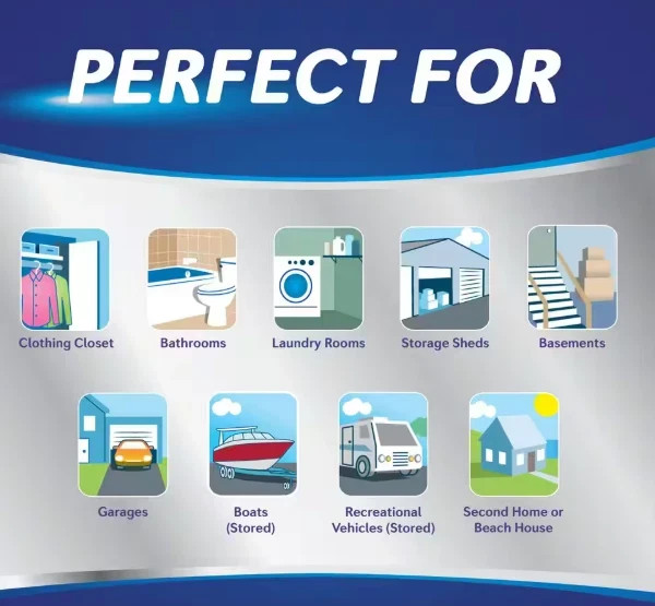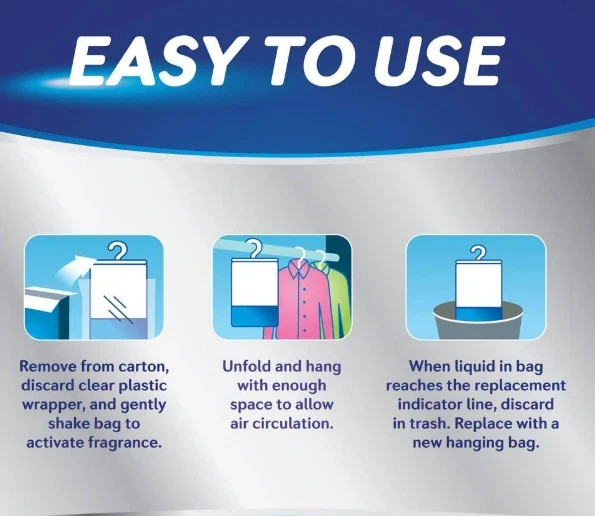 About This Product Attract and trap excess moisture with DampRid Hanging Bag Moisture Absorber. The time-release fragrance technology releases a pleasant scent continuously over the life of the product. The hanging bag design is perfect for college dorm rooms, closets, laundry rooms, and storage areas where clothes often collect unpleasant odors. With 10% more moisture absorbing power*, DampRid lasts longer to absorb excess moisture, creating and maintaining the optimal humidity level wherever moisture is a problem. Each dehumidifying bag can last up to 60 days depending on the level of humidity and temperature. When the bag is finished, simply discard and replace. Not for use in moving vehicles. Keep out of reach of children. Read & follow all label directions. *Compared to a 14-ounce bag. Highlights ATTRACTS AND TRAPS EXCESS MOISTURE: DampRid Fresh Scent Hanging Moisture Absorber attracts and traps excess moisture from the air, eliminating musty odors and creating fresher, cleaner air. 10% MORE MOISTURE ABSORBING POWER: Now with 10% more moisture absorbing power*, DampRid lasts even longer. *Compared to 14-ounce bag. GREAT FOR COLLEGE DORM ROOMS, apartments, closets, laundry rooms, or any space where stagnant air is often a problem. LONG LASTING FRAGRANCE: Features Time-Release Fragrance Technology, which releases a pleasant scent continuously over the life of the product. EASY TO USE: Simply remove from packaging, gently shake to activate fragrance, and hang with enough space for air circulation. EASILY DISPOSABLE: When collected liquid in bag reaches the replacement indicator line, simply discard in trash and replace with a new hanging moisture absorber. LONG-LASTING FRESHNESS: Think of it as a dehumidifier without electricity. Each moisture absorbing bag lasts up to 60 days depending on temperature and humidity. DON'T JUST COVER UP ODORS, ELIMINATE THEM! Includes 3 Fresh Scent moisture absorbing bags. Also available in Pure Linen, Lavender Vanilla and Fragrance Free.