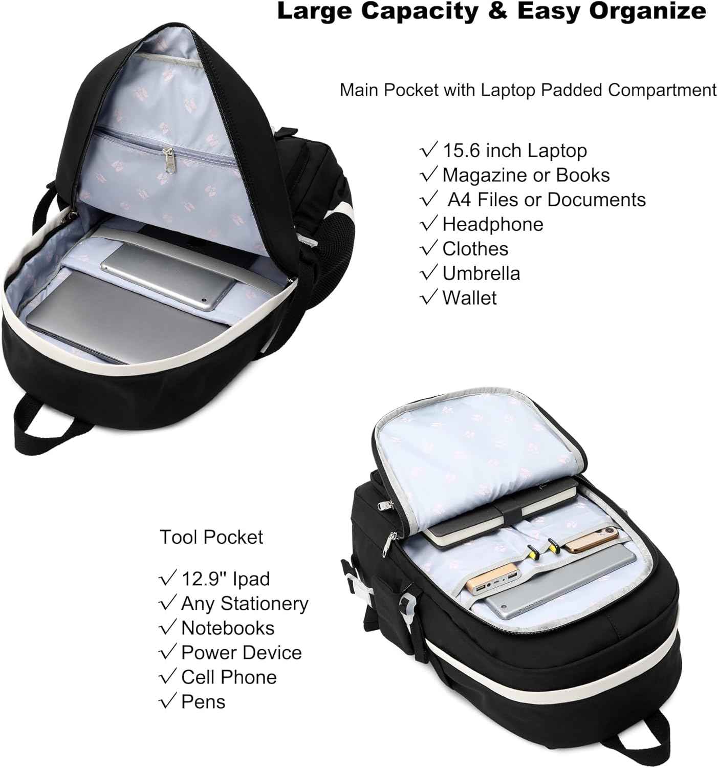 Store New Arrivals Add to Favorite View Feedback Contact Fast deliveries to the customer's home Quality customer service John Make the customers happy! Laptop Backpacks 15.6 Inch College Backpack Elementary Middle High School Bag Large Cute Bookbags anti Theft Travel Back Pack Casual Daypack Kids Book Bag for Teens Girls Women Students (Black) Description 【Large Size & Gift】: The size of back pack is 13.8"x7.5"x17.8"(L*W*H), Weight:1.65 LB. The laptop bag with padded compartment sleeve fit for 13.3,15.6 ,16.1 inch tablet. This women book bag also along with fluffy ball key pendant and personality badge as gift makes the bags more fashionable and unique 【Waterproof Material &Smooth Zipper】: The campus backpack is made of waterproof, ultra-lightweight, high density nylon fabric and cute printing polyester lining. The metal zippers closure are used by the premium quality zippers to ensure the long-lasting usage 【Safety & Comfortable 】: The considerate belt on the both side can create a solid base of support if you’re packing a lot of stuffs on the back packs. The Widen and thicken durable S-shape straps is well-padded, adjustable and comfortable to carry. The luggage belt on the back can be fitted on luggage/suitcase to make your travel more convenience 【Multi-compartments & Large Capacity 】: The travel backpack for women has 5 separate different size pockets and two side pockets meet your daily storage. The front three pockets can hold charge device and other small items, convenient for your daily organization. The main pocket of includes laptop padded sleeve with elastic belt and hidden inner zipper pockets. The front tool pockets also come with multiple compartments to provide roomy space for necessities 【For Any Ages & Occasion】 The waterproof backpack purse is stylish enough for casual and student use, while the design provides the multi functionality. Backpack perfect for young teens, girls, ladies. The basic multipurpose daypack for most of your needs, easy to match your cloths, suitable for short trip, work, shopping, university, school, etc Product Description Item model number Gbp0001 Age Range Description Big Kid, Kids, Teen, Adult Capacity Total 30 Liters Number Of Items 1 Color Black Product Dimensions 3 x 13 x 16 inches Country of Origin China Item Weight 1.4 Pounds Department Teens,Girls, Women Units 1 Count ABOUT US We offer the best prices around on high quality products. Our E-store includes media such as books, movies, music and games while offering electronics, toys, sporting apparel, clothing, tools, general home, garden items and more. SHIPPING We are always working hard to ensure your package arrives as soon as possible. Please understand that some factors like weather, high postal traffic, and the performance of shipping companies are outside of our control. We offer free shipping to the lower 48 states and ship within 2 business days of payment, usually sooner. We do not accept P.O. Boxes. Please provide a physical address. For shipping outside of the continental USA, we only use eBay's Global Shipping Program. The item is shipped to KY and then sent to the rest of the world. International customers are responsible for all duties and taxes. Continue to 'check out' to calculate costs for shipping the item to your country. Messages regarding eBay's Global Shipping Program MUST be directed at eBay EXCLUSIVELY. RETURNS We offer a 30-Day Return Policy on items in which you are not completely satisfied with. You have the option of a full-refund or an exchange of the item. No returns are available on items shipped outside of the USA PAYMENT We accept PayPal. CONTACT US This page content is yet to come Please ad us to your favorite seller and visit again later Thank You CUSTOMER SATISFACTION We try our very best to make sure every customer is completely satisfied. If there's a problem, message us! We're happy to help. WE ACCEPT