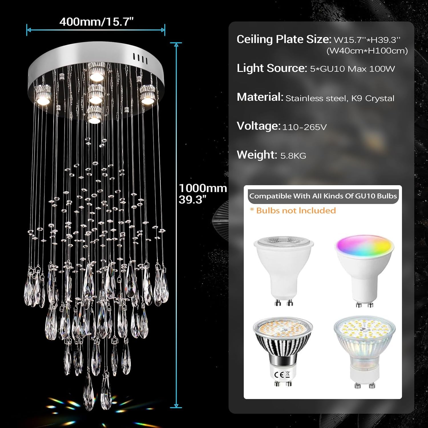 15.7''Raindrop Chandelier 5-Lights Flush Mount Ceiling MP083-400CM, Chrome Product Details Brand: YPQXYHDA Color: Chrome Material: K9 crystal, Polished Stainless Steel Style: Modern Light fixture form: Chandelier Room Type: Kitchen, Bedroom, Living Room, Dining Room Product Dimensions: 17"L x 17"W x 5"H Specific Uses For Product: Indoor Indoor/Outdoor Usage: Indoor Power Source: Corded Electric Installation Type: Flush Mount Special Feature: Adjustable Color Temperature Control Method: App Finish Type: Polished Shade Material: Crystal Number of Light Sources: 5 Voltage: 220 Volts Theme: 15.7''Modern Luxury 5-Lights Flush Mount Ceiling Light Light Color: White Warm Shape: Round Included Components: Mounting Hardware Lighting Method: Downlight Number of Items: 1 Wattage: 50 watts Unit Count: 1.0 Count Brightness: 6500 Lumen Mounting Type: Ceiling Mount Shade Color: White Fixture Type: Non Removable Manufacturer: YPQXYHDA Size: MP083-400CM Model Name: MP083-400 Part Number: MP083-400-Chrome Item Weight: 9.08 pounds Country of Origin: China Item model number: MP083-400 Finish types: Polished Special Features: Adjustable Color Temperature Batteries Included?: No Batteries Required?: No Color Temperature: 3500 Kelvin Product Dimensions : 17 x 17 x 5 inches; 9.1 Pounds Item model number : MP083-400 Manufacturer : YPQXYHDA Country of Origin : China Brand: YPQXYHDA Color: Chrome Material: K9 crystal, Polished Stainless Steel Style: Modern Light fixture form: Chandelier Modern Flush Mount Ceiling Light: The gorgeous and elegant style reflected by this crystal chandelier, it is very artistic and eye-catching, it can blend well with bedroom, living room, bathroom, dining room, hallway, staircase or kitchen Exquisite teardrop chandelier: The raindrop chandelier is made of superior quality K9 crystals and sturdy stainless steel, which is both durable and exquisite, it is the best choice for you to decorate your house Easy Installation: The installation process is easy, we provide all the mounting hardware and installation manual, no need to worry about the trouble Crystal Flush Mount Ceiling Lights Size: The teardrop crystal chandelier is 15.7 inches in height and the bulb type: GU10*5 (bulb not included), the maximum power is 100 W, which can provide your room with sufficient light, compatible with a wide range of bulbs: energy-saving bulbs High Quality Service: If you have any questions about crystal chandelier, please feel free to contact us, we will reply you within 24 hours