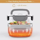 Features: Food Grade Material The electric lunch box is made of food grade PP plastic and 304 stainless steel, which is high-temperature resistant, non-toxic, durable, eco-friendly and safe to use. Heating Up Fast Using PTC original constant temperature heating, low-consumption heat cycle to keep food at a suitable temperature and keep the moisture of the food. It normally takes 25-50 minutes to warm the food. (If the food was taken out of the fridge or where the ambient temperature is low, the heating time should be extended appropriately). Healthy Meal Anywhere No microwave required and wait in line for heating food. Now simply plug in and heat up your food at office or in car/truck using the 110/12V power cables. Enjoy your warm & healthier homemade food. Leak Proof Cover Improved cover design, the cover will not move during use, more tightly covered.Because leak-proof seal ring design is added, it will prevent fluid leakage even when walking or in sloshing car. Easy to Clean The electric lunch box meets the safety standards of dietary materials. The inner container is removable, therefore it is very easy to clean. Portable Design There is a portable handle on the lid, you can carry the food in the lunch box everywhere like in your car/truck and office. Also useful for picnic, road trip and camping etc. Warm Tips: Please do not clean the heating base with water, and do not add water to the heating base. Specification: Type: Electric Lunch Box Material: 304 Stainless Steel + Food Grade PP Plastic Color: Gray + Green Dimension: 9.3 x 6.6 x 4.3 in Stainless Steel Bowl Dimension: 8.3 x 5.7 x 2.7 in Power Cord Length: 31.5 in Power Cord (Car) Length: 32.5 in Capacity: 1.5L Heating Time: 25-50 min Power: 110V/ 50Hz / 40W Package Included: 1 x Electric Lunch Box 1 x Stainless Steel Spoon 1 x Stainless Steel Fork 1 x Stainless Steel Container 1 x Plastic Compartment Box 1 x Power Cord 1 x Power Cord for Car 1 x Manual