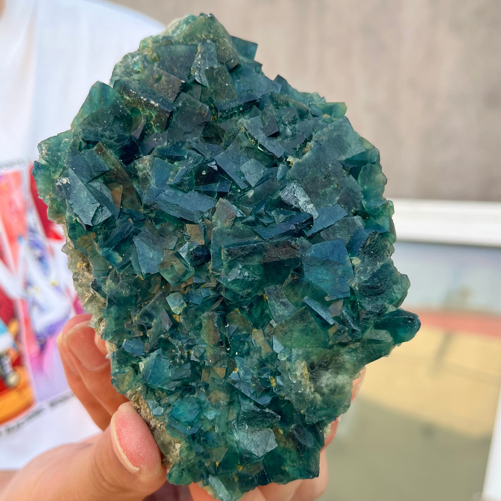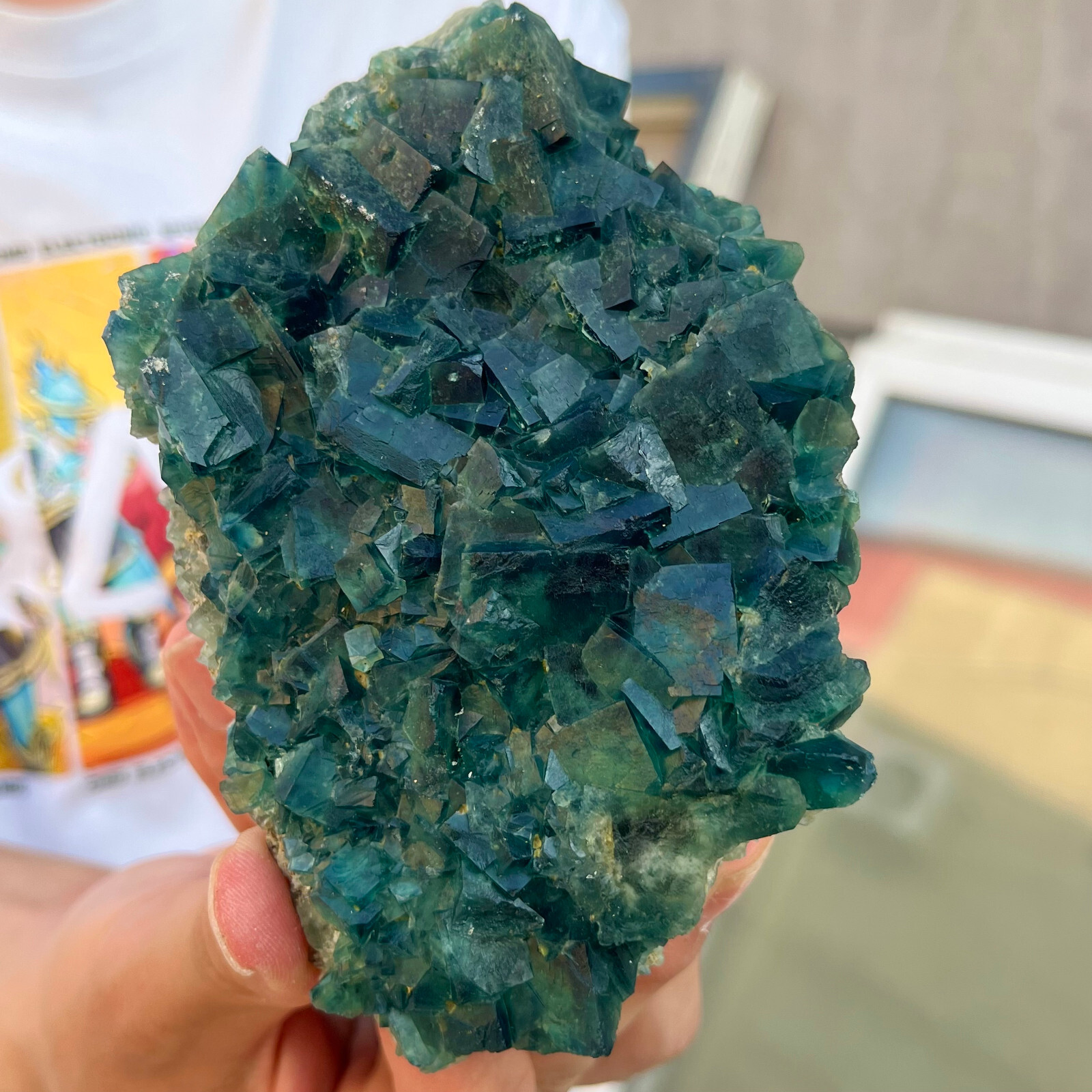 Amazing blue green hues in the fluorite. Item got here super quickly and it was wrapped completely in bubble wrap and tape. It looks exactly like the picture. It’s a solid chonk of a rock with interesting white flecks of crystal on the bottom. A+ transaction!!!