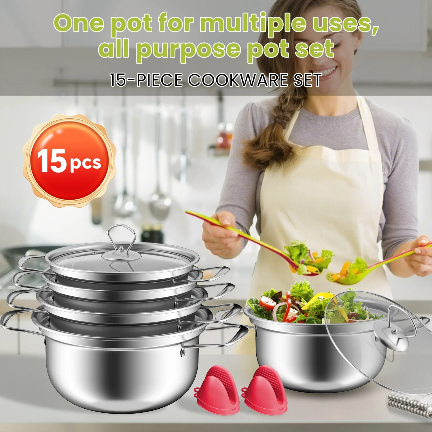 $ 59.6615-Piece Stainless Steel Cookware Set Non-Stick Pots Pans Skillet Wok Stew Pot