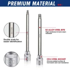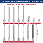 【WILD SIZE SELECTION】 3/8 inch drive long torx bit socket set contains: T10, T15, T20, T25, T27, T30, T40, T45, T47, T50, T55, T60, Universal Joint, 1/2" to 3/8" adapter, 1/4" to 3/8" adapter. 【PREMIUM MATERIAL】Torx bit socket made of S2 alloy steel, heat treatment after forging, high hardness, strong torque. After plating and polishing to provide superior rust resistance, meet and exceed ANSI standards. Each sleeve has a precise size and bevel for easy use to protect bits and fasteners. 【EXTRA ADAPTER】This 18-Piece Star bit socket set contains extra three adapters, 1-Piece Universal Joint, 1-Piece 1/2" to 3/8" adapter, 1-Piece 1/4" to 3/8" adapter. Those additional adapters help you work with different kinds of tools. 【LONGER DESIGN】Extra-long design allow bit to reach deep into especially narrow, recessed areas. Insert smoothly with precision chamfered bit ends. 【EASY TO STORE】 Long torx bit sockets are all placed in a storage box, easy to access at any time. If you encounter any problems while using our products. Please contact us by email, our professional after-sales team will contact you and solve your problems in time.