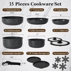 15-Piece Non-Stick Cookware Set with Detachable Handles - Induction & Oven Safe Product Overview: Upgrade your kitchen with the SODAY 15-Piece Non-Stick Cookware Set, designed for effortless cooking and efficient storage. This versatile set includes all the essentials you need for various cooking methods, from sautéing to simmering. The premium granite coating and detachable handles make it perfect for both small kitchens and RVs. Key Features: Complete Set: Includes 1x 11" Sauté Pan, 1x 8" Frying Pan, 1x 10.6" Frying Pan, 1x 2QT Saucepan, 1x 3QT Saucepan, 2x Removable Handles, 2x Glass Lids, 4x Pot Protectors, 2x Fridge Storage Lids. Efficient Storage: Detachable handles allow for compact nesting and efficient storage, saving up to 75% of kitchen cabinet space. Nonstick Excellence: Granite coating ensures easy food release and quick cleaning, with healthier cooking using less oil. Compatibility with All Stovetops: Works with gas, electric, and induction cooktops. Durable and Safe Handle: Handle supports up to 22 lbs with a double-locking mechanism for added security. Easy to Clean: Non-stick coating simplifies cleanup; hand wash recommended for optimal longevity. Oven Safe: Safe to use in the oven, offering added versatility for your cooking needs. Ideal Gift: A great gift for Mother's Day, Father's Day, housewarmings, or any occasion. Product Specifications: Feature Details Material Aluminum, Granite Coating Color Black Handle Material Bakelite Number of Pieces 15 Compatibility Works with all stovetops, including induction Oven Safe Yes Dishwasher Safe Yes Weight 5 lbs Item Dimensions 4 x 6 x 5 inches Special Features Non-toxic, Easy Cooking & Cleaning, Detachable Handle Product Care Wash with mild dish soap, use silicone or wood utensils Maximum Weight Recommendation 22 lbs Warranty 1-Year Limited Warranty How to Use: Cooking: Use the pots and pans for frying, sautéing, simmering, and more. Cleaning: Wipe with a paper towel or rinse with water. Storage: Detachable handles make it easy to store the cookware in small spaces. Images: