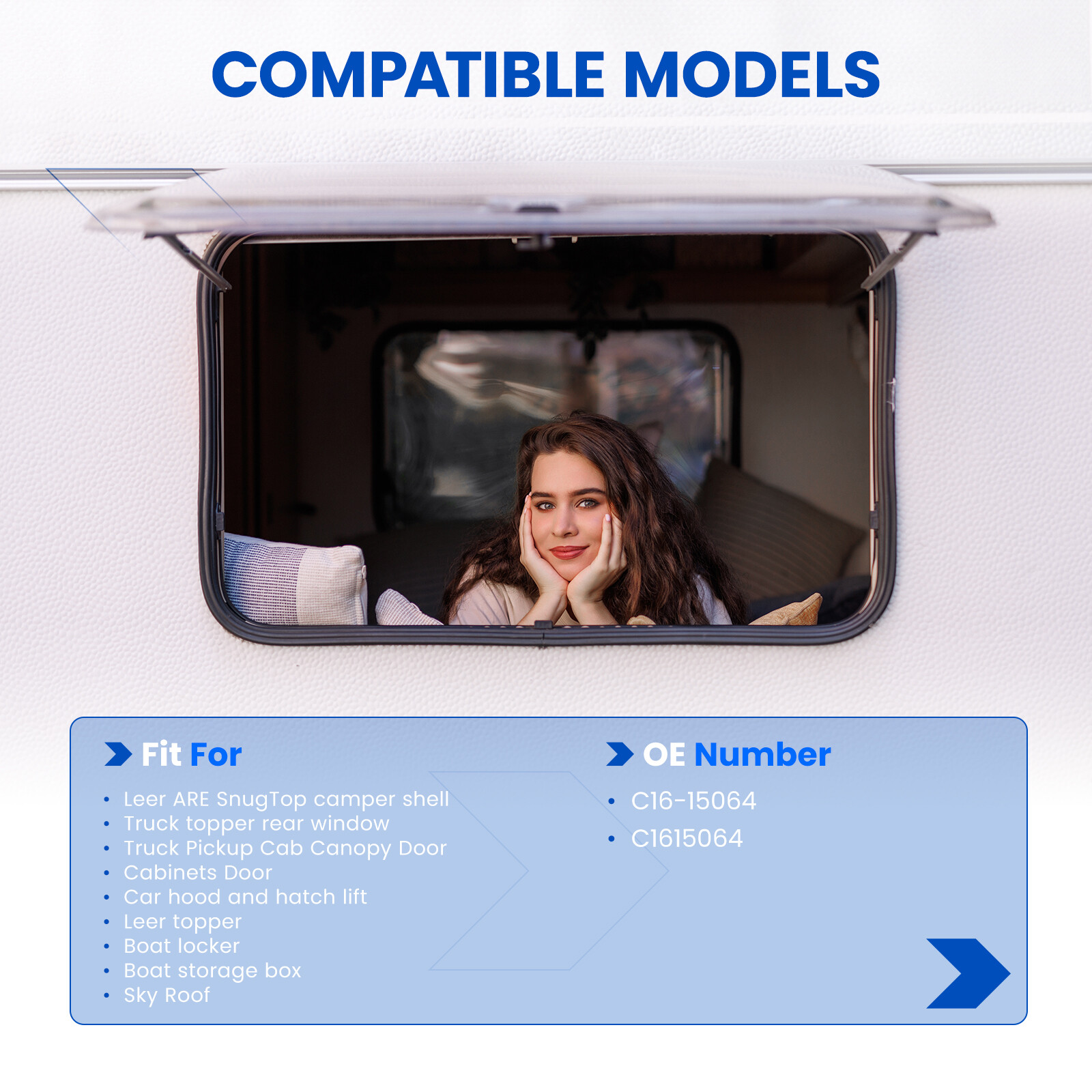 Auto Part Position: Rear Extended Length: 15 Inches Compressed Length: 8.8 Inches Item Weight: 20.03 ounces Package Dimensions: 15.94 x 12.01 x 0.98 inches Country of Origin: China Manufacturer Part Number: C16-15064 FIT FOR: Leer ARE SnugTop camper shell Truck topper rear window Truck Pickup Cab Canopy Door Cabinets Door Car hood and hatch lift Leer topper Boat locker Boat storage box Sky Roof Auto Part Position: Rear Extended Length: 15 Inches Compressed Length: 8.8 Inches Item Weight: 20.03 ounces Package Dimensions: 15.94 x 12.01 x 0.98 inches Country of Origin: China Manufacturer Part Number: C16-15064 FIT FOR: Leer ARE SnugTop camper shell Truck topper rear window Truck Pickup Cab Canopy Door Cabinets Door Car hood and hatch lift Leer topper Boat locker Boat storage box Sky Roof C16-15064 Gas Struts Specifications 15 inch 20lb/89N Gas Struts Shocks Spring Lift Support. Extended Length 15 inch. Compressed Length 8.8 inch. 15 Inch Shock Interchange Number Find the below Interchange number on your OEM gas shock cylinders for a exact match: C16-15064 C1615064. C1615064 Struts Package ContentPackage contains 15 inch gas struts*2. Installation with a flat screwdriver, no special tools required.