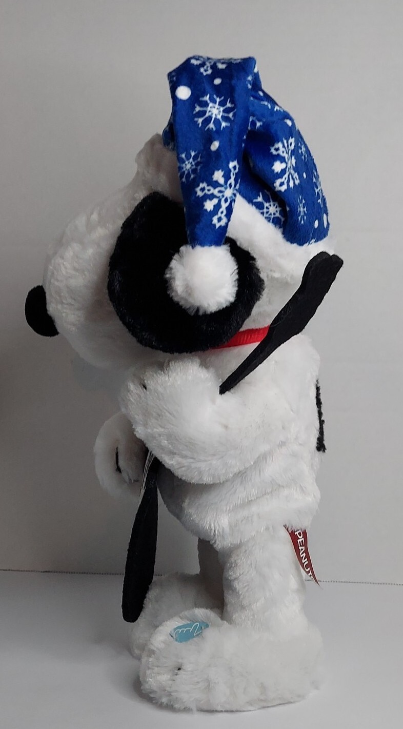 15 inch Snoopy is holding a black felt guitar, and he plays Linus and Lucy while dancing. He is wearing a blue Santa hat with white snowflakes. He is in good condition and works. Takes 3 AA batteries, not included.