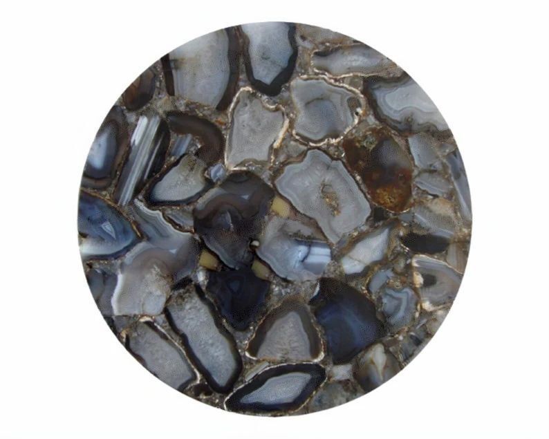 Welcome To Stone-Craft- Creations Shop Description Very unique Art by Indian Artist ,Coffee/Side Table top Used Material: Natural Agate Stones Arts Size: 15"x15" Inches Color: As photo Shape: Round Pattern: Handmade Room: Bedroom, Dining Room, Hallway, Home Office/Study, Kid’s Bedroom, Kitchen, Laundry/Utility Room, Living Room,Patio, Playroom Packaging: Wood & Foam Export Packing Shipping: Air Can Be customize ,Please Message us your desired Size 1. It can be used as a Dining Table, Guest table, coffee table, center table top in show room as well as a gift for your loved ones. 2. The table top is made in Agra India & fully handmade. 3. The top will be delivered by FedEx or DHL free of cost door to door. 4. If there is any local tax,custom duties or Vat will be paid by the buyer at the destination. 5. The parcel is dispatch with proper packing & fully insured covering all kind of risk. 6. To maintain the table top is simple soap & water & dry cotton cloth. 7. If You Are Looking Something Customize, Let Us Know We Will Make For You As Per Your Design, Size & Shape. 8.Table top does not includes any wooden, marble stand or base if you like to buy marble or wooden base or stand that will be charged extra. Marble Agate Table Tops We are Manufacturer & Exporter of marble agate table tops. These marble agate table tops have different shapes like Round Table top, Octagonal Table Tops, Rectangle / Dining table tops, Square Table tops, Chess Table tops, Taj Mahal Table tops, Custom Designs Table tops also make marble Table top Base and Stand. Then we can be used as dining tables, coffee tables, Center tables, conference tables, chess boards, reading tables, bar tables , Garden table, side and corner tables or any other use as per the indoor and outdoor decor. They can also be placed outdoors in the garden, as marble is stain free, offers great resistance to the forces of nature, and can withstand heavy temperatures. We also meet customized requirement and offer our marble table tops at industry leading prices. About Agate Stone- Agate is a rock consisting primarily of cryptocrystalline silica, chiefly chalcedony, alternating with microgranular quartz. It is characterized by its fineness of grain and variety of color. Although agates may be found in various kinds of host rock, they are classically associated with volcanic rocks and can be common in certain metamorphic rocks. Ancient use of agate stone Agate is one of the most common materials used in the art of hardstone carving, and has been recovered at a number of ancient sites, indicating its widespread use in the ancient world; for example, archaeological recovery at the Knossos site on Crete illustrates its role in Bronze Age Minoan culture Types Of Agate 1. Fortification Agate This is the most common and distinctive type of agate. In these agates, bands crystallized into concentric layers that more or less follow the shape of the cavity. The banding resembles an aerial view of a fort 2. Water-Line Agate (also called water-level or onyx) During its formation, silica-rich solution either entered the cavity slowly laying one band at a time, excess water drained out leaving a small amount of silica to settle out into separate bands, or the vesicle filled under low pressure. In any case, the silica crystallization in water-level agates is controlled by gravity in one orientation, forming a stack up of parallel bands. 3. Shadow Agate Some agates exhibit a shadow effect in which there is what appears to be movement across the agate layers when the specimen is rocked back and forth (or your orientation to the specimen moves). This optical effect only occurs when there are alternating translucent and opaque bands. It is caused when light goes into the agate, but is not reflected out. 4. Tube Agate Tube Agate During the formation of some agates, parallel projections of tiny hair-thin mineral rods grow first within the silica gel, around which later the chalcedony agate micro-crystals form. In some cases the inclusions remain, but sometimes they weather away leaving hollow tubes that subsequently fill in with silica. 5. Eye Agates This mysterious agate characteristic is believed to be formed when most of the silica gel drains from the cavity, leaving only a droplet that “beads up” on the inside wall of the cavity. This droplet crystallizes into solid chalcedony “eyes”. In some cases, crystal growth will continue from this droplet in a manner similar to the formation of stalactites in caves. Later, the pocket fills in with the usual deposition of chalcedony microcrystals. 6. Plume Agate These agates initially had formations on their outside layer that formed prior to the deposition of chalcedony bands. They are filament growths of mineral inclusions that resemble ferns or feathers. 7. Geode Agate Geode Agate In some cases the supply of silica-rich water runs out before the entire cavity fills in. When there is a hollow center within a crystalline outer fill, the specimen is considered a geode. Not all geodes have agate banding, but many do. Also, the inner layers can form into several different types of silica mineral crystals and may even have other types of mineral crystals. 8. Moss Agate Moss Agate Moss agates have clusters of mineral inclusions that resemble plants, trees, or landscapes. Most moss agate inclusions are comprised of iron or manganese oxide. In some cases, the inclusions inhibit chalcedony banding allowing the mineral clusters free reign to grow within the silica gel. 9. Seam Agate Seam agates for in cracks within host rock, rather than in rounder pockets. The bands form in parallel rows that follow and fill in the crack or seam.