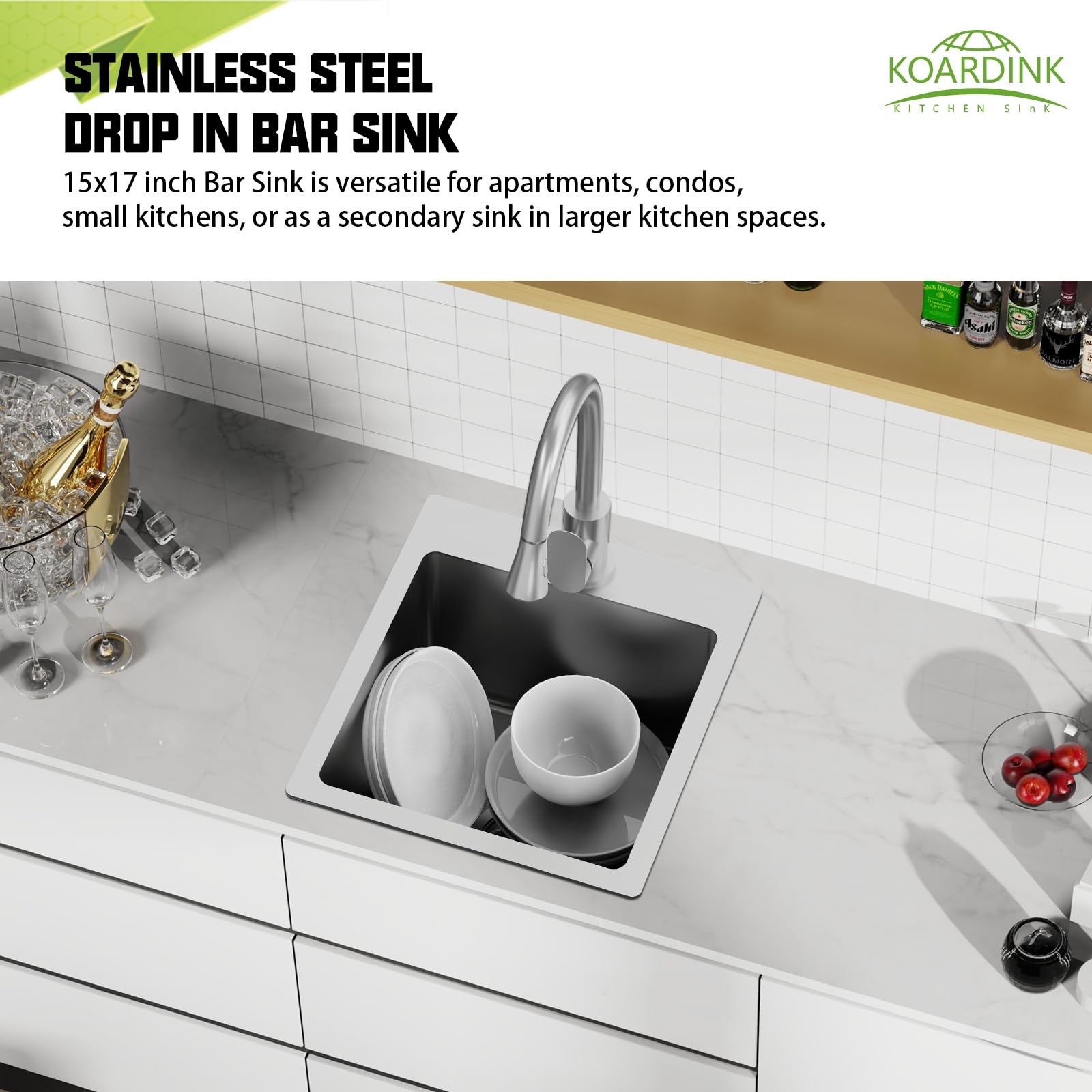 "Stainless steel 15"" x 17"" kitchen and bar sink adds a modern and stylish touch to your kitchen and bar. The original color adds sophistication and elegance, while the integrated accessories provide a sleek and seamless look Stainless steel kitchen sink can withstand high temperatures without warping or discoloration,suitable for these who handle hot pans and boiling water frequently. Drop in kitchen sink is resists stains less likely to show water spots or mineral deposits, making it easier to maintain its shine. Routine cleaning with mild soap and water is typically sufficient to keep the sink looking clean. small kitchen sink,bar sink, drop in kitchen sink,kitchen & bar sink,wet bar sink,single bowl kitchen sinks,stainless steel kitchen sink,top mount kitchen sink,15 Kitchen Sink,17 Kitchen Sink Single Bowl Kitchen Sink Combo: Including 11Gauge SS 15in kitchen sink, , silicon mat and drain assembly for bar sink. Stylish appearance and practical versatility make topmount kitchen sink combo an excellent investment for modern kitchens and home bars. Single bowl sink can meet your needs while offering practicality and ease of use. Versatile Compatibility: 15x17 in kitchen sink can work well with various countertop materials, such as granite, quartz, or marble. Stainless steel kitchen & bar sink complement various kitchen styles and designs. Whether you have a contemporary, traditional, modern kitchen or bar, a stainless steel sink can seamlessly integrate into your aesthetic. Stainless Steel Sink: With exterior size-15"x17"x9", interior size 13"x13"x9", topmount kitchen&bar sink seamlessly transition between kitchen and bar environments, catering to different needs in both settings. Drop in kitchen&bar sink is practical choice for versatile use across kitchen and wet bar applications. Fast Drainage Design: X-groove located on the bottom surface of the drop in kitchen sink is design to guide the water towards the drain, minimizing water stagnation and reducing the chances of water accumulation. X-groove and US standard drain assembly of kitchen also reduce the amount of time spent waiting for the sink to empty. Surface Technology: Brushed finishing and nano technology make topmount kitchen sink resistant to scratches and temperature, repeling water and oil stain makes it easier to clean. Anti-condensation coating prevent water droplets forming. Sound dampening pad reduce noise caused by running water or dishwashing.