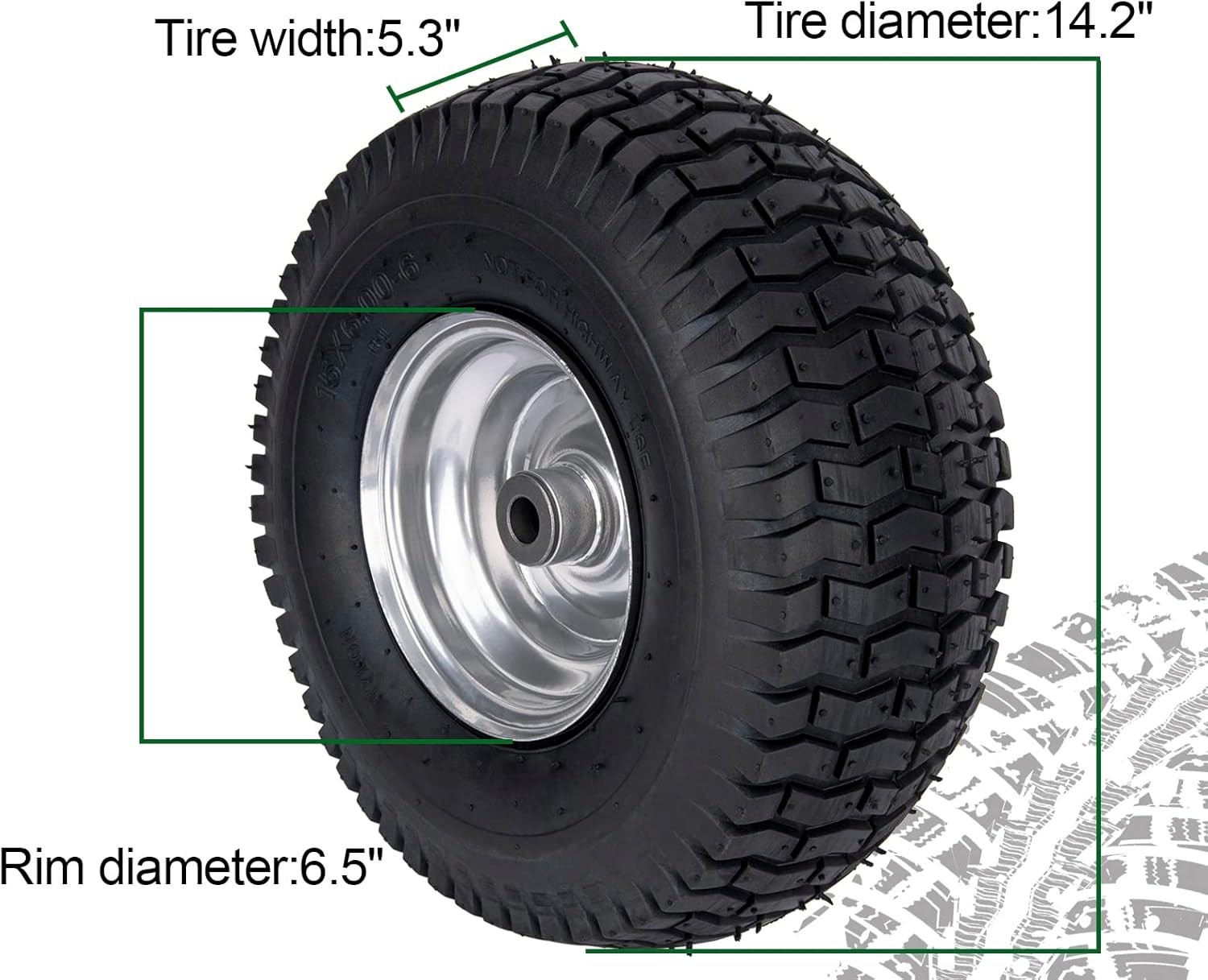 15x6.00-6 Lawn Mower Tire and Wheel Front Tire Compatible with John Deere Craftsman Husqvarna Riding Mowers Lawn Tractors 【Compatible and Specifications】 15x6.00-6 Lawn mower tires and wheel compatible with Craftsman John Deere Husqvarna Riding mowers, fit most lawn mowers that tires with an outer diameter of around 14.2 inches, and a section width of 5.3 inches, 15x6.00-6 Tires with 3/4" Sintered iron bushings with have a rim diameter or around 6 inches and a hub that is about 3 inches long. Maximum load capacity of 570 pounds, maximum psi of 30. 【Durable High Quality Lawn Mower Tires】 15x6.00-6 Riding lawn mower tire and wheel are made of high-quality natural rubber, pneumatic 4 Ply rating, with multi-trace tread, provides maximum grip and traction, increase the tire and the ground friction to enhance comfort, provides good shock absorption. 15 x 6.00-6 lawn mower tires replacements for many kind of riding lawn mower, lawn tractor, garden tractor front tire and more. 【Why Choose Us】 15 x 6.00-6 Tire and wheel set are pre-assembled kits, you don't have to worry about finding separate wheel rims, tires and inner tubes for your lawn mower, save your valuable time and let you easily change lawn mower tires. 【Warm Notic】 15 x 6.00-6 Lawn mower front tire not for highway. Before Buying: please compare the pictures and compatibility, check the size of the original tire on your vehicle to determine whether it is appropriate. Note: Our 15x6.00-6 Lawn Mower Tire are only suitable for vehicles within 260 kg. 【Package Included and After-Sales Guarantee】 2 Pack 15 x 6.00-6 Tube and Wheel Set 15 x 6.00-6 Lawn mower tires supports 180 days return and exchange.Our company attaches great importance to the shopping experience of each customer.Risk-free shopping, If you have any quality problem during warranty period, Please contact us in time. We will try our best to solve the problem. Customer satisfaction is our tireless pursuit.