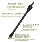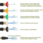 BROAD APPLICATION – The pressure washer extension wand kit are wildly used in house cleaning works. With this 16" spray wand in equipment, it is easy to wash place hard to reach, such as windows, decks, roofs, cars and fences. PREMIUM MATERIAL – The extension pole for pressure washer is made of brand-new PA66 (main body) and brass (QC end). Plastic structure makes the extension rod form-fitting to your power washer gun, which means more leakless than usual metal wand. STRONG ENDURANCE – Benefit from the material mentioned, this power wash extension pole withstands high pressure at ease. Maximum pressure bearable can level up to 4000 psi. Ideal for professional cleaning matters. PROFESSIONAL CONNECT – The bayonet fitting is specifically compatible with Husky, Greenworks, Ryobi, Homelite, Harbor Freight pressure washing gun. 1/4" quick connect fitting ensures your seamless connection with surface cleaner, undercarriage cleaner, foam cannon and other pressure washer attachments. PROFESSIONAL CONNECT – The bayonet fitting is specifically compatible with Husky, Green Works, Ryobi, Homelite, Harbor Freight pressure washing gun. 1/4" quick connect fitting ensures your seamless connection with surface cleaner, undercarriage cleaner, foam cannon and other pressure washer attachments. PREMIUM MATERIAL – The extension pole for pressure washer is made of brand-new PA66 (main body) and brass (QC end). Plastic structure makes the extension rod form-fitting to your power washer gun, which means more leakless than usual metal wand. STRONG ENDURANCE – Benefit from the material mentioned, this power wash extension pole withstands high pressure at ease. Maximum pressure bearable can level up to 2000 psi. Ideal for professional cleaning matters. ADJUSTABLE SPRAY PATTERNS – Orifice Size 0° (red), 15° (yellow), 25° (green), 40° (white), soap (black) Customize your cleaning experience with adjustable spray patterns, from wide coverage for larger areas to focused streams for stubborn dirt. Making your pressure washer more effective than ever. ATTENTION: WORKING PRESSURE CANNOT EXCEED 2000 PSI.