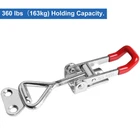 16 Pack Toggle Clamp 4001 Metal Hand Tool Quick Release Pull Latch Holding Capacity 360lbs Smoker Clamps for Small Door, Smoker Lid, Box Case Trunk, Jig - 360lbs Holding Capacity - Heavy duty toggle clamp is made of steel, plating zinc, soft plastic - You could keep 2 doors closed tightly or loosely after adjust the pull bar. - Toggle Latch Clamp is adoption of unique self-lock, prevent the latch accidental opening, convenient to operate. Specifications - Material : Premium Steel, soft plastic - Holding Capacity : 360lbs (163kg) - Maximum overall length : 4-1/8 inch - Minimum overall length : 3-1/2 inch - Dia. of the lock hole: 1/4 inch (Fit for M4 Screw) Package include - 16 x 360lbs Adjustble Toggle Clamp 【Holding Capacity】The tension capacity of smoker door latch is 163Kg / 360 Lbs, 4001 Style Toggle Latch Clamp 【Material】 Toggle Latch Hasp Clamp is made of cold rolled carbon steel, plated zinc, corrosion resistant. With oil and stain resistant red vinyl solid hand grips 【Adjustable Installation Distance】The toggle clamp latch iInstallation distance could be adjusted by adjustable pull bar, keep 2 doors closed tightly or loosely as you like. And the self-lock hole can be locked with an anti-theft lock 【Applications】 These quick release quick latch fit for cabinet, door, box, trunk, smoker lid, jig assemblies. Great gadget for home, office, restaurant, factory, etc 【Easy Installation】 Just fix them on the cabinet door or box through countersunk hole with screws, very easy to install