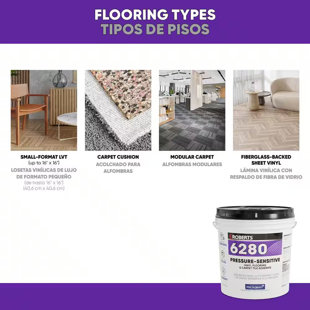 Fast Shipping On All Items 30 Days Money Guarantee Customer Support Excellent Service 100% Satisfaction Satisfaction Guaranteed 16 Qt. (4 Gal.) Pressure Sensitive Releasable Multi-Flooring Adhesive Specification Adhesive Type Carpet Color Family Off White Commercial / Residential Commercial / Residential Dry time (hours) 10 Flooring Material Features Antimicrobial,Latex based,Solvent free Flooring Product Type Carpet Adhesive Flooring Type Carpet,Prep & Protection,Vinyl Indoor/Outdoor Indoor Location Floor Product Weight (lb) 34.8 lb Returnable 90-Day Lifetime Warranty No Manufacturer Warranty Adhesive Bond: Limited Lifetime (when installed by Certified Flooring Pro) or Limited 10 Years Container size (qt) 16 Maximum Coverage Area (sq ft) 900 sq ft Product Width (in) 12.5 in 12.5 inches. Weight: 34.8 lb Item Description For installation of carpet tile, small-format LVT and sheet vinyl Bonds with concrete, APA-rated plywood, and terrazzo substrates Powered by Microban for superior mold and mildew protection ROBERTS 6280 Pressure Sensitive Releasable Multi-Flooring Adhesive is an acrylic latex, solvent-free adhesive formulated for installation of modular carpet tile, small-format LVT (up to 16" x 16") carpet cushion, and fiberglass-backed sheet vinyl. Powered by Microban, this antimicrobial product protection helps fight the growth of stain and odor-causing bacteria that can cause product degradation. For use on concrete, APA-rated plywood, and terrazzo substrates in interior installations, ROBERTS 6280 is an enviro-friendly, solvent-free and LEED compliant adhesive with a low VOC: less than 1 g/L. Made in the USA, it offers a Limited Lifetime when installed by Certified Flooring Professional. Made in the USA. About us We offer the best prices around on high quality products. Our E-store includes media such as books, movies, music and games while offering electronics, toys, sporting apparel, clothing, tools, general home, garden items and more. Shipping We are always working hard to ensure your package arrives as soon as possible. Please understand that some factors like weather, high postal traffic, and the performance of shipping companies are outside of our control. We offer free shipping to the lower 48 states and ship within 2-3 business days of payment, usually sooner. We do not accept P.O. Boxes. Please provide a physical address. For shipping outside of the continental USA, we only use eBay's Global Shipping Program.The item is shipped to KY and then sent to the rest of the world. International customers are responsible for all duties and taxes. Continue to check out to calculate costs for shipping the item to your country. Messages regarding eBay's Global Shipping Program MUST be directed at eBay EXCLUSIVELY. Returns We offer a 30-Day Return Policy on items in which you are not completely satisfied with. You have the option of a full-refund or an exchange of the item. No returns are available on items shipped outside of the USA Satisfaction We try over very best to make sure every customer is completely satisfied. If there's a problem, message us! We're happy to help. Payment Options Shop With Confidence