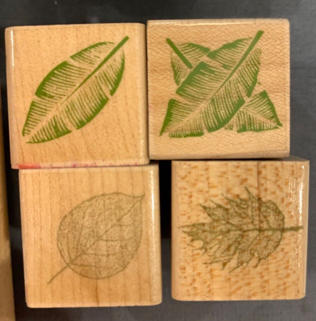 This set of wood mounted rubber stamps features a wide variety of botanicals, including single leaves, leaf branches, winter trees, grasses and 4-leaf sets.