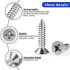 Sheet-Metal Screws: Have deeper and sharper threads, so many woodworkers use them, but the type of wood screw is quickly becoming very popular. Wood Screws: Made of Stainless steel 304 which is superior to regular steel and zinc plated fasteners, The case-hardened, extruded-thread wood screw has threads that are very deep and sharp. Screwdriver Types: The head screw has a cross-shaped recess in its head. This type is much easier to drive with a power screwdriver because the bit doesn’t jump off the screw head as easily. Easy To Use: You can drive these screws into softwood and plywood without drilling a pilot hole. For hardwoods, a pilot hole is still recommended. Be used in plastic, fiberglass, deck, or wood sheet stainless steel screws. Package: #8 x 1/2"---50Pcs #8 x 3/4"---35Pcs #8 x 1"---35Pcs #8 x 1/2"---35Pcs #8 x 1-1/4"---25Pcs #8 x 1-1/2"---25Pcs Flat Head Sheet Metal Screws or Wood Screws.