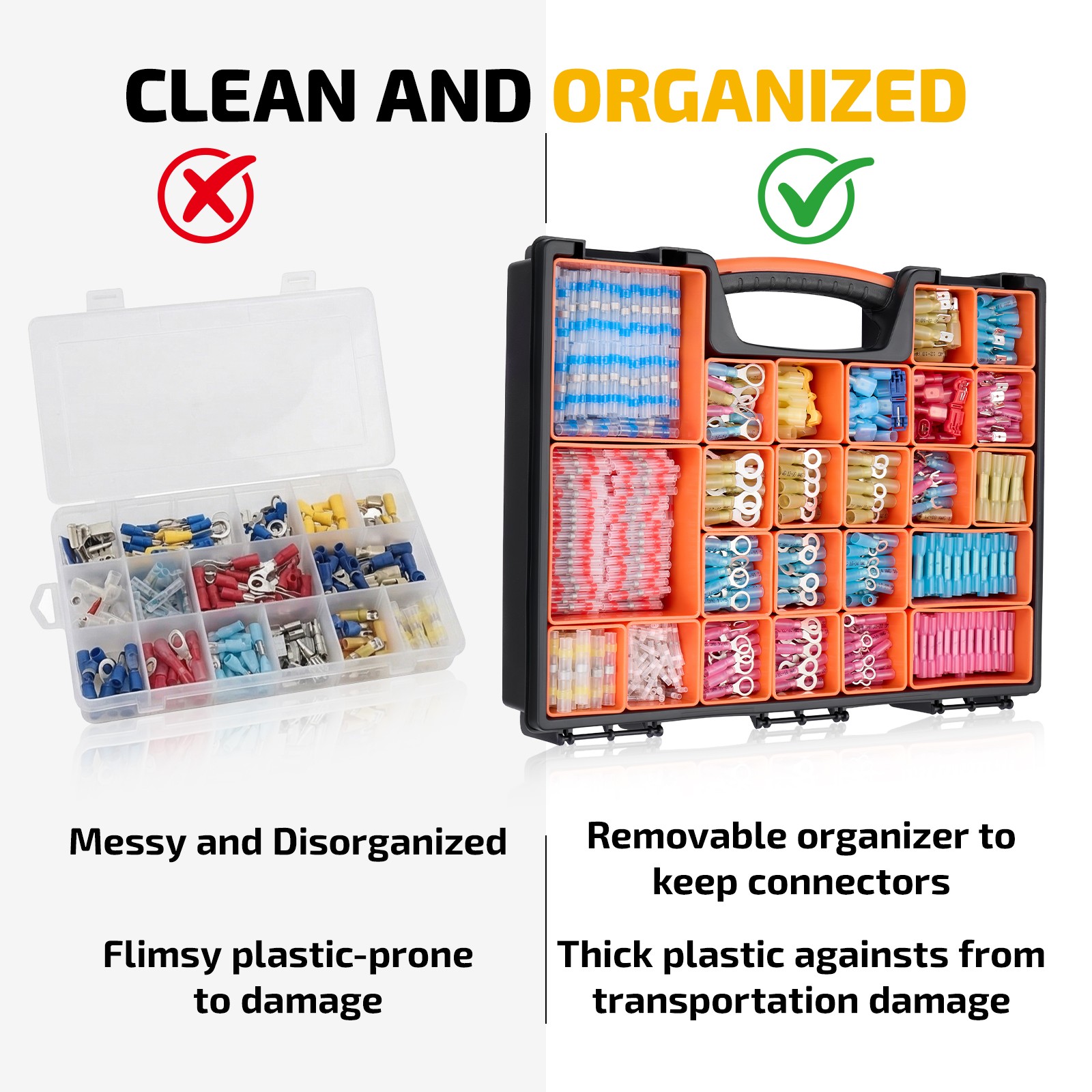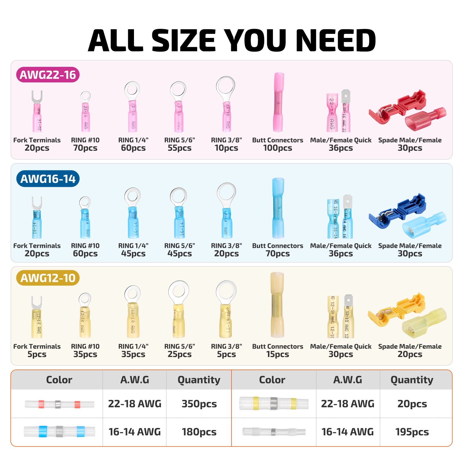 Extra-Large Capacity, One-Stop Solution 1. The complete set includes 1,622 pieces, covering all sizes from 26 to 10 AWG. It contains all types of terminals, including heat-shrink solder terminals, ring terminals, spade terminals, male and female spade terminals, and T-type no-strip terminals, making it the perfect solution for home, automotive, and marine applications—all in one box. 2. High-Quality Red Copper for Superior Conductivity and Durability Features a thickened purple copper core for excellent conductivity and high tensile strength. The heat-shrink sealed structure is waterproof and moisture-resistant, with anti-aging properties that prevent breakage and ensure long-term stability without loosening. 3. Heat-Shrink and Solder Sealing for More Secure Connections Features a dual seal of heat-shrink tubing and solder, providing waterproofing, corrosion resistance, and protection against loosening. Ideal for humid or vibration-prone environments such as cars, motorcycles, boats, and outdoor applications. 4. Categorized Storage for Portability and Organization Includes a premium storage case with a handle and removable dividers, allowing terminals to be sorted by type for quick access, easy transport, and clutter-free organization. Extremely Versatile Applications 5. Perfectly suited for cars, motorcycles, yachts, home use, DIY projects, and circuit repairs, meeting a wide range of wiring needs including lighting, audio systems, equipment switches, and circuit modifications. Complete range of specifications, highly versatile 6. Covers mainstream wire gauges from 22-18, 16-14, and 12-10 AWG. Includes male and female spade, ring, fork, and T-type connectors—all without the need to strip wires—making them suitable for the vast majority of wiring scenarios. Payment Delivery details Terms of sales About us Contact us Payment 1.We only accept PayPal. PayPal is the only online payment method we accept. Please make sure you have a valid/confirmed PayPal account prior bidding. 2.All Paypal Payments must be Confirmed. Payment must be made within 48hrs of the auction end time. Non-Paying bidders will be reported. 3.When you get your package,maybe you will pay some charges, it's taxes for local customs,not pay to us, and the fees are depends on the customs, all buyer are same. Delivery details 1.Items will be shipped within 2 business days after payment is received. 2.We ship to your eBay address. Please make sure your eBay address is correct. Buyer takes responsibility if eBay address is wrong. 3.Import duties, taxes and charges are not included in the item price or shipping charges. Please check with your country customs office for these additional charges. 4.We shipping using UPS or USPS from our nearest warehouse to you. Tracking numbers will be emailed upon shipment. Terms of sales 1.Please feel free to email us if you have any question. 2.We appreciate you contact us via eBay message when you are not satisfied rather than open case or leave negative feedback directly. We'll try our best to solve the issue. 3.Refund will be issued once we receive your returned items. Buyer is responsible for all return shipping charges. 4.Please contact us for return process before you return the item. 5.All items for exchange or refund must be returned in "as new" condition. About us We are the responsible seller ,always provide high-quality products and best service .If you have any questions, please contact us, and will try our best to help you. Please contact us by eBay Message, and we will reply you within 24 hours. Thank you very much! Contact us We are the professional auto parts manufacturer , and provide line lock, AN hose end fittings , fuel line , fuel filter , fuel regulator , exhaust cutout , exhaust tips , exhaust muffler and so on .The quality of the product to be secured. If you have any questions or any needs , please contact us , and will try our best to help you.