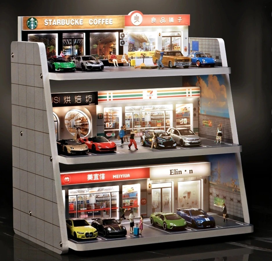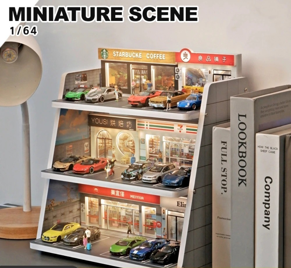 1:64 Auto Shop Miniature Scene Diorama - LED Parking Lot Garage Display Box This product is a highly detailed Miniature Scene Diorama designed for displaying and enhancing 1:64 Scale diecast car collections (like Hot Wheels, Matchbox, etc.). Built as an Auto Shop or Garage Display Box , it features integrated LED Lighting and realistic architectural details, transforming a simple collection into a dynamic, illuminated scene. ✅ Product Highlights: Perfect 1:64 Scale: Sized precisely for common diecast car models, ensuring all vehicles and scenery elements are proportional and realistic. Integrated LED Lighting: Includes built-in LED lights (often USB or battery powered) to realistically illuminate the Auto Shop or Parking Lot interior, drawing focus to the displayed models. Realistic Scene Setting: Detailed construction mimics a functional Garage or auto repair shop, often featuring elements like garage doors, windows, tools, and textured flooring. Display Box Design: Constructed as an enclosed or semi-enclosed Display Box (often using clear acrylic or sturdy PVC), which helps protect models from dust while providing a clear viewing window. Collector's Backdrop: An excellent item for collectors to create realistic backdrops for photography and to proudly showcase their favorite or rare models in a dynamic setting. 🛠 Specifications: Component: Display Diorama / Miniature Scene Scale: 1:64 (Compatible with most small diecast cars) Model: Auto Shop / Garage / Parking Lot Material: PVC, Acrylic, or ABS Plastic (Varies by manufacturer) Features: Integrated LED Lighting, Enclosed Design, High-Detail Graphics Use Case: Diecast Car Collection Display, Scale Model Photography, Hobby Accessory. 💡 Illuminate and showcase your collection with this impressive 1:64 Auto Shop LED Diorama Display Box !