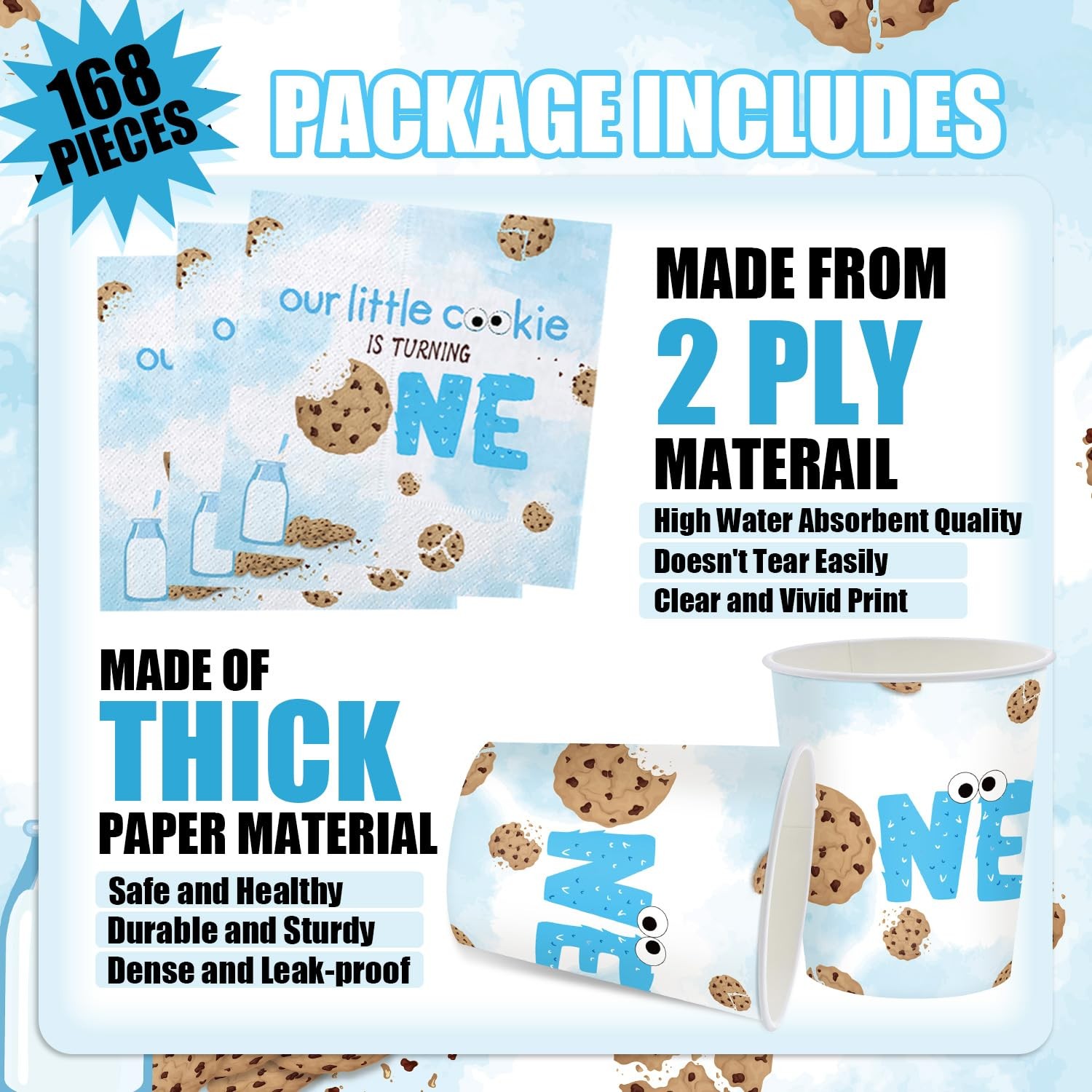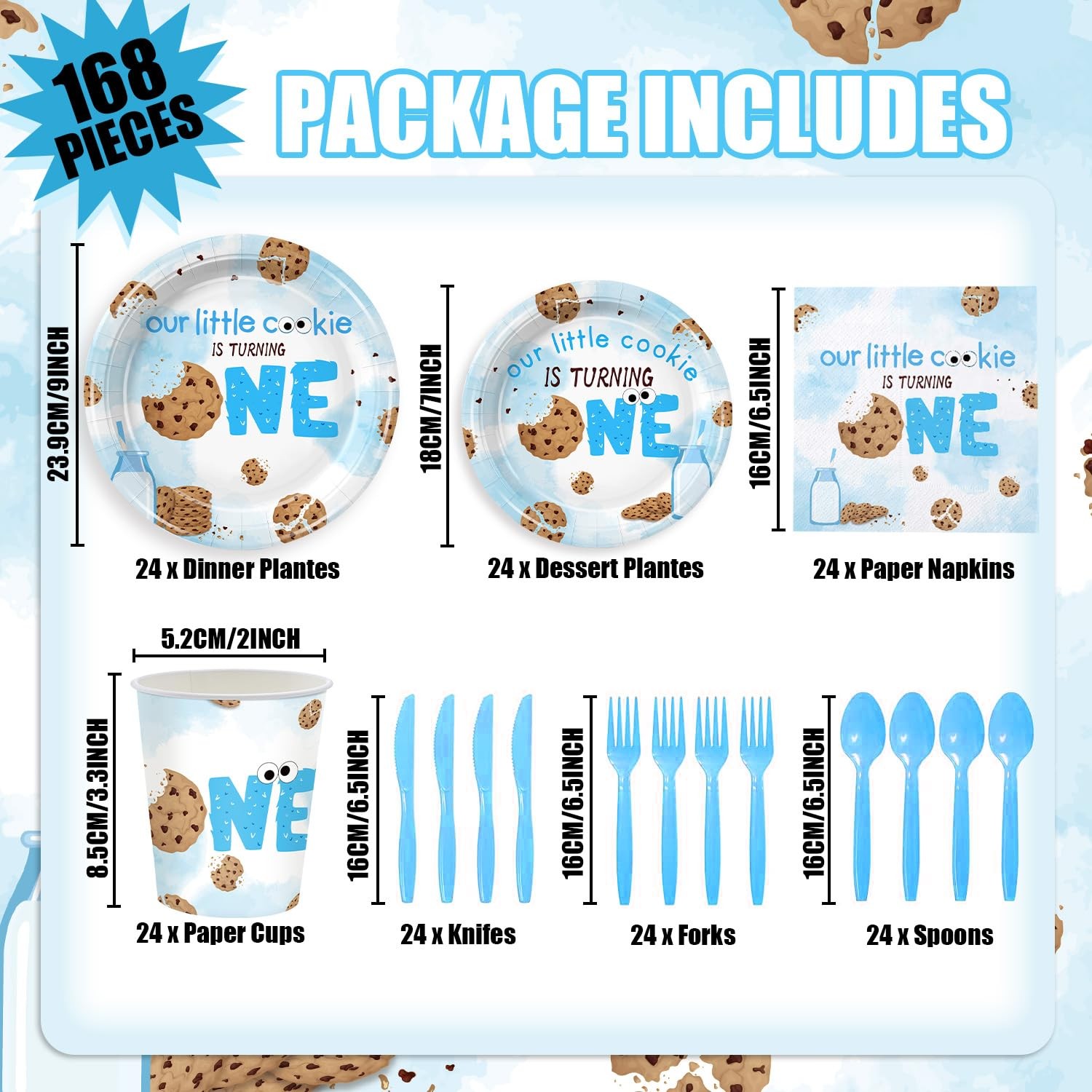 This milk and cookies tableware set includes:24 Pcs 9 inch paper plates and 24 Pcs 7 inch paper plates, 24 Pcs 6.5 inch napkins, 24 Pcs paper cups, 24 Pcs spoons, 24 Pcs knives and 24 Pcs forks. There are a total of 96 pieces in this set, which will add fun to any milk and cookies theme birthday party. Serve 24 Guests:This Milk and Cookies party kit has all you need for 24 guests, include 24 Pcs 9 inch paper plates and 24 Pcs 7 inch paper plates, 24 Pcs 6.5 inch napkins, 24 Pcs paper cups, 24 Pcs spoons, 24 Pcs knives and 24 Pcs forks, totally 168Pcs. They will offer complete set and sufficient quantity for you to treat 24 guests Superior materialsl: Our milk and cookie birthday party plates and napkins are made of high-quality paper, with bright colors that are not easily faded, torn, or broken. Non toxic, odorless, heat-resistant, and safe for food. To provide you with a pleasant user experience, allowing you to use with peace of mind Cute and Bright Design:Milk and Biscuit Party Set, featuring a bunch of chocolate cookies and milk drink elements. The fun and cute design also adds joy and happiness to your party, making your party experience the best value Wide Applications:Our milk and cookie birthday party supplies are suitable for various occasions, such as children's birthday parties, first birthdays, baby showers, and even casual gatherings. It effortlessly complements various themes and decorative styles, adding a touch of fun and surprise to any celebration event Easy to Clean:The milk and cookies birthday party decorations can reduce your cleaning time, so you can spend more time with friends and family at this milk and cookie party. After the party, put away the tablecloth and all the garbage and throw them into the trash can. Quick and efficient cleaning!