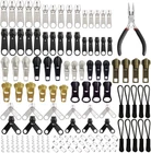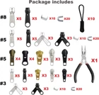 #5 usually used for coats & jacket; metal tooth sliders. #3 #5 usually used for jeans; mental tooth sliders. #3 usually for small clothes and dress; nylon coil sliders. Packaging contains: 15 x silver sliders (#3, #5, #8), 15 x black sliders(#3, #5, #8), 6 x double black sliders (#3,#5), 6 x double silver sliders (#3, #5), 30 x bottom stoppers (#3, #5, #8), 60 x top stoppers (#3, #5, #8), 4 x antique brass metal zipper sliders with lock (#5), 6x silver and black plastic zipper sliders with lock (#3,#5) 6 x gold zipper sliders with lock (#3,#5),4 x black resin zipper sliders with lock (#5), 1 x zipper install pliers tool, 10 x black zipper extension pulls. Good quality: Made of high-strength metal, superb electroplating process, not easy to fade. Extensive use: provides frequently-used applied replacement sliders in many sizes for the repairing of bags,clothing,coats, outdoor tents, jackets, purses, jeans, backpacks, luggage, and some DIY project. How to do it: 1>Remove top zipper stop. You can use the pliers tool to do that. 2>Remove the old slider. 3>Put the new slider on. 4>Then use the pliers tool to press zipper stop back into place. There are various sizes commonly used replacement sliders in everywhere for repairing of clothing, bags,outdoor tents, coats, jackets, purses,luggages, purces, backpacks and so on. Product Description Zipper Repair and Installation Instructions How to install the zipper replacement: How to install the zipper replacement: Step 1: Take off the top of the zipper tape, remove the unusable zipper slider. Step 2: Take correct type of new slider in the right direction and fix it onthe zipper tape start from tape bottom, make sure teeth are matching of bothside right and left. Step 3: Fix the bottom stops on the tape. Please distinguish front and back,thesquare side should be the front side. Best position, covering the bottom of achain. The bottom of the plug bite teeth, long lasting, elegant appearance. Step 4:Make the top stops on the tape up 1mm away from the teeth to ensure theappearance and firmness. Step 5:Please move the slider up and bottom to test the function after finishabove 4 steps,polish zipper teeth with wax or spray to make zippers smootherand move easily Note: Please confirm your zipper size andtype before you buy. All things in the package are small part, please keep away from children. Multi function zipper kit, suitable for repairing most zippers Extensive use: provides frequently-used applied replacement sliders in many sizes for the repairing of bags,clothing,coats, outdoor tents, jackets, purses, jeans, backpacks, luggage, and some DIY project. Zipper for Bag Zipper for Coat Zipper for Jacket Zipper Pulls Helpful Zipper Repair Kit: EuTengHao 169 Pieces Zipper Replacement Zipper Pull Zipper Repair Kit withInstall Pliers Tool for Clothing Jackets Purses Luggage Backpacks.s. Packaging contains: 5 x silver sliders (3#, #5, #8), No lock 5 x black sliders (3#, #5, #8), No lock 3 x double pull black sliders (3#, #5), No lock 3 x double pull sliver sliders (3#, #5), No lock 10 x bottom stoppers(3#, #5, #8). 20 x top stoppers (3#, #5, #8). 4x antique brass single pull metal zipper sliders (#5)-With Lock 6x black single pull plastic zipper sliders (#3,#5)- With Lock 6x silver single pull plastic zipper sliders (#3,#5)- With Lock 6 x gold zipper sliders (#3,#5)-With Lock, 4 x black resin zipper sliders (#5)-With Lock 1 x zipper install pliers tool, 10 x black zipper extension pulls. Add to Cart Customer Reviews 4.7 out of 5 stars 662 3.7 out of 5 stars 530 4.7 out of 5 stars 611 4.7 out of 5 stars 611 4.7 out of 5 stars 611 Price $9.99 $ 9 . 99 — — — — Quantity 120Pcs 183Pcs 100Pcs 100Pcs 100Pcs