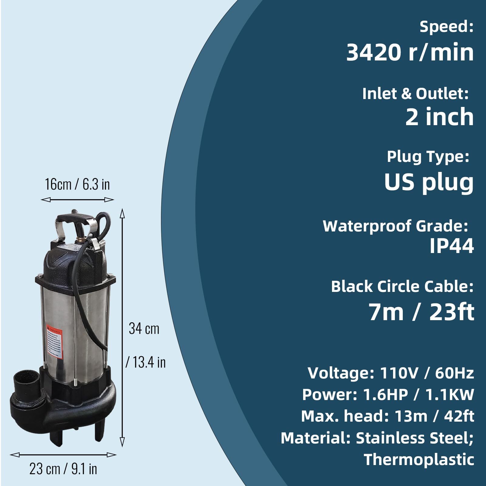 1.6HP Submersible Sump Pump 1100W Cast Iron Sewage Pump 106GPM w/23ft Cord 110V Details: 【Specification】 [Voltage]:110V/60Hz; [Power]:1.1KW;1.6HP; [Max. head]:13m/42ft; [Max. flow rate]:105.67GPM; [Speed]:3420r/min; [Inlet & Outlet]:2 inch;[Plug Type]:US plug; 【Material】 This sewage pump body is made of high quality stainless steel and thermoplastic, Sewage injection pump has anti-corrosion cast iron frame and anti-rust surface, which can be used underwater for a long time. 【Wide Application】 Dawot Stainless Steel Sump Pump is designed for residential and commercial sewage and dehydration, such as sewage systems, septic tanks, wastewater discharge, sewer and basement flooding. Keeping the basement dry during rain, snowmelt and other large currents is perfect. 【Easy and Safe to Use】 The sewage pump with a built-in automatic thermal overload protection will prevent the motor from overheating and combustion. When the pump is idling, it automatically closes to protect the motor. At the same time, the highly efficient copper motor with low noise ensures excellent performance. Fully immerse the pump in water before starting. 【Warranty】 We are confident with the quality of our products, which won’t let you down. Please contact us if you have any problems about our product, we will reply you as soon as possible within 12 hours.(Attention: Defects due to improper use of the pump are not within the warranty and it is prohibited to use with no water.) PRODUCT SPECIFICATION Voltage: 110V/60Hz Power: 1.6HP / 1.1KW Max. head: 13m / 42ft Max. flow rate: 105.67GPM / 24m³/h Speed: 3420r/min Package Dimensions: 53 × 27 × 23 cm / 21 × 11 × 9.1 inch OD Pipe: 2 inch Outlet: 2 inch Material: Stainless Steel Cord Length: 7m / 23ft Package Weight: 18kg / 40Lbs Package Include: 1 x Sewage Pump; 1 x Electric Cord; 1 x User Manual FAST SHIPPING WARRANTY EASY RETURNS CONTACT US FAST SHIPPING We only ship to US mainland 48 states and worldwide via ebay international shipping program. We don't offer direct international shipping. Consult us if you live in Hawaii, Alaska or Virgin Islands. Also we don't ship to any APO/FPO/PO BOX address. We offer FedEx Ground or Home delivery in optional which can make it faster, charge additional shipping fee. Delivery is any day from 1-5 business days (Monday through Friday, excluding weekends and holidays) WARRANTY This item is covered by our 12 months unlimited mileage warranty. Any customer may use the same outlets to facilitate a return or warranty claim. Any item must be returned within 30 days of the original purchase for refund; item(s) retaining a warranty may be returned beyond 30 days but within the remaining warranty period. Returns that are not subject to warranty may accrue a restocking fee and should be returned at the customers cost. We reserves the right to request proof of purchase and mechanical failure in the event of any warranty claim; any returns or claims that violate Ebay's Online Return policies will be reported. We holds no responsibility or liability for additional repairs, damages (punitive or non-punitive), loss of time, or any other extraneous circumstances created by a purchase made from said party. EASY RETURNS We understand that sometimes you need to make a return or an exchange. All we ask is you send it back in the same condition it was received - new and un-used. If the product you receive is not the one you ordered, please take photos of any visible of visual reference and contact us directly; photos must be CLEAR and VISIBLE. Logistical claims must be filed within 30 days of received the product; exchanges in these cases will be handled promptly and at?no cost to the customer. In order to process a return or exchange, please call us or send us a message through eBay and we will be happy to assist you immediately. However,any return that is NOT defective or NOT received in error, is the responsibility of the customer. We DO NOT cover any shipping costs and/or additional fees associated with the transaction. CONTACT US We are open Monday to Friday 8am to 5pm Mountain Standard Time, and Saturday 9am to 1pm MST. Our friendly staff are available during these hours. Please feel free to call us, or send us a message via eBay. We aim for complete customer satisfaction and repeat business; we will be more than happy to help you feel 100% comfortable with your purchase.