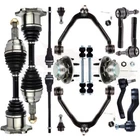 1.Notes (1).Please check the fitment chart above before payment making sure all the suspension parts listed on this page are compatible with your automobile. (2).Please refer to Moog official website before narrowing down your search so as to avoid unnecessary item not as described return requests. (3).Please contact our customer services for targeted discount after all the items are received if you have reached any targeted discount thresholds, the terms of which is at the bottom of this page. 2.Fits These Vehicles Cfspeed-autoparts 16PC Front Control Arm Wheel Hub Bearing CV Axle Shaft For Sierra Silverado 1500 1.Notes (1).Please check the fitment chart above before payment making sure all the suspension parts listed on this page are compatible with your automobile. (2).Please refer to Moog official website before narrowing down your search so as to avoid unnecessary item not as described return requests. (3).Please contact our customer services for targeted discount after all the items are received if you have reached any targeted discount thresholds, the terms of which is at the bottom of this page. 2. Fits These Vehicles 2002-2006 Cadillac Escalade 2003-2006 Cadillac Escalade ESV 2002-2006 Cadillac Escalade EXT 2002-2006 Chevrolet Avalanche 1500 1999-2006 Chevrolet Silverado 1500 2000-2006 Chevrolet Suburban 1500 2001-2006 Chevrolet Tahoe 1999-2006 GMC Sierra 1500 2000-2006 GMC Yukon 2000-2006 GMC Yukon XL 1500 3.Package Includes 2x Wheel Hub Bearing -515036F 2x Front Inner Tie Rod End -ES3488 2x Front Sway Bar End Link -K80631 2x Front Lower Ball Joint -K6541 2x Front Outer Tie Rod End -ES3493T 1x Front Steering Idler Arm - Heavy Duty -K6534 1x Pitman Arm - With 4 Grooves - Heavy Duty -K6536 2x Front Upper Control Arm And Ball Joint -K80942 2x CV Axle Shaft -60-1009 Ball Joint Replacement Guideline: If there is a knocking or clunking noise in the area of the front axle when the car is traveling over road bumps, potholes or curbs, then there is usually a defect in a component of the wheel suspension. Picture(A) The side of the front axle from which the (vibration) noise is emanating can already be determined during a test drive. The type of noise also already provides certain indications for maintenance regarding which components might be faulty. Picture(B) 1.Raise the vehicle and remove the front wheels. 2.To loosen the fastening screws and fixing nuts of the compression ball joint more easily, spray them with rust remover and allow to act for a few minutes. Picture(C) 3.Loosen the fastening screws of the broken ball joint on the control arm and remove the nuts. Picture(D) 4.Loosen and remove the fixing nut of the ball joint on the steering knuckle. Tip:If the ball stud rotates, hold the ball stud in place with a hexagon socket. Picture(E) 5.Remove the bad or worn ball joint from the control arm. 6.Loosen the compression ball joint on the steering knuckle using a suitable special tool. Picture(F) 7.Clean the cone connection. Tip:For better sealing and durability of the ball joint sleeve, a little silicone grease can be applied to the contact surface. Picture(G) 8.Insert new compression ball joint in the control arm and steering knuckle and tighten with new fixing nuts. 9.Reinstall front wheels. Lower the vehicle and tighten the wheel studs to the tightening torque specified by the vehicle manufacturer. 10.Measure the chassis and adjust it using the various holes on the compression ball joint if necessary. 11.Finally, carry out a test drive. Sway Bar Stabilizer Link Replacement Guideline: While driving, the following signs may indicate a faulty sway bar stabilizer link: (1).Rattling and thumping noises on rough roads. (2).Imprecise vehicle handling. (3).Stronger inclination of the vehicle during cornering. If the sway bar stabilizer link is found to be defective, it should be replaced as described below. Picture(A) 1.Raise vehicle and remove front wheels. Tip:Always check both stabilizer links and replace them in pairs if necessary. 2.Spray fastening nuts of the stabilizer link with rust remover and let act for a few minutes. Picture(B) 3.Loosen the lower fastening nut of the stabilizer link at the stabilizer and remove. Tip:If the ball stud also starts to turn, hold it with a suitable tool. 4.Press stabilizer link out of torsion bar. Picture(C) 5.Loosen the upper fastening nut of the stabilizer link at the suspension strut and remove it. Tip:If the ball stud also starts to turn, hold it with a suitable tool. Picture(D) 6.Press stabilizer link at suspension strut out of bracket. Picture(E) 7.Insert new stabilizer link at suspension strut. Picture(F) 8.Tighten stabilizer link at suspension strut to the tightening torque specified by the vehicle manufacturer. Tip:Secure the ball stud against twisting with a suitable tool. Picture(G) 9.Insert new stabilizer link at stabilizer. 10.Tighten stabilizer link at stabilizer to the tightening torque specified by the vehicle manufacturer. Tip:Secure the ball stud against twisting with a suitable tool. Picture(H) 11.Remount the front wheels. Lower the vehicle and tighten the wheel studs to the tightening torque specified by the vehicle manufacturer. Tip:Even if replacing the stabilizer link does not directly affect the chassis setting, we recommend checking the axle setting and adjusting if necessary after working on the suspension. 12.Conclude with a test drive. Tie-Rod End Replacement Guideline: If you feel a bump in the steering when driving over road bumps or curbs, this might be due to worn tie rod ends or inner tie rods. Clicking noises during sudden steering movements can also be symptoms of a defective tie rod. In order to determine the exact cause and replace the defective tie rod, the car must be elevated with a vehicle lift in order to be examined more closely. This useful tip applies to the exchange of tie rod ends and inner tie rods, which together form the so-called tie rod. Picture(A) Note: Cleanliness is extremely important when 