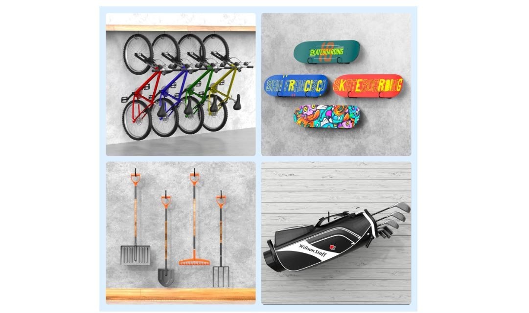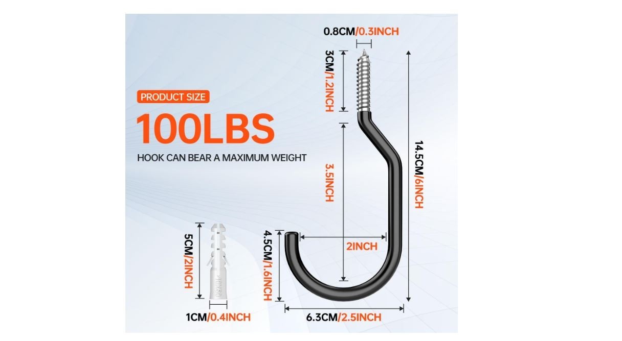 16-Pk Heavy-Duty Ceiling/Bike Hooks,100 lb Load,6-in Long Hooks Garage Storage Color Black Material Alloy Steel Finish Type Powder Coated Mounting Type Ceiling Mount,Wall Mount About this item These practical hooks are made of high-strength carbon steel, with a galvanized surface and excellent rust and corrosion resistance. For ease of installation and stable and reliable performance, our bicycle hooks for walls and ceilings feature a 1.2 inch deep threaded design that can tightly grip walls and have a powerful load capacity of up to 100 pounds. You can confidently hang your mountain bike and bicycle on our bicycle hook. The hook part is coated with sturdy and elastic PVC material, which can achieve scratch free contact with your favorite bicycle and ensure 100% protection. 16-Pack storage hooks:6 inches (L) x 2.5 inches (W). 8 hooks per pack.Comes with a plastic case,easy to install and organizer. They are the perfect solution for hanging bicycles, mountain bikes, fishing rods and tools, ladders, snowboards, golf bags, strollers, as well as more items in garages, gardens, and homes.
