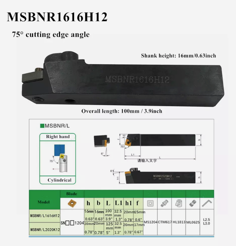 Description Product name: Cylindrical Turning Tools Material: Carbide with CVD/PVD coating Good wearproof,Smoothing cutting and chip evacuation, High finish,and non-stick blade, Square shaped Double sided 8 corner available in use Used for turning and finishing on a wide range of materials,Designed for Steel, cast iron and non-ferrous materials About the carbide insert: SNMG432/SNMG120408-MA Carbide with PVD/CVD coating , Good wear proof ,smoothing cutting and smooth chip, for M SBNR Tool holder About the MSBNR Tool holder: MSBNR1616H12 Overall length:100mm/3.9inch Shank height:16,,/0.63inch W renches : L2.5 and L3.0 Holder weight about 260g Used for turning and finishing Notice Buy a number of products are discounted. these are Suitable for machining Steel parts/stainless steel /cast iron. If you need a better product please enter the store search or write to tell me. We have more products in the upload, please pay attention to my shop.