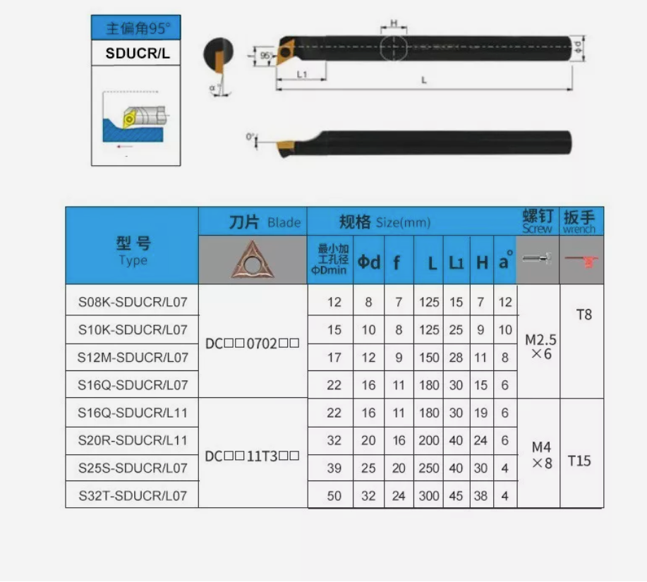 Model: S16Q-SDUCL07 Cutting direction: the left hand Insert: DCMT0702 Material: alloy steel Color: Black Package include: 1PC S16Q-SDUCL07 1PCS DCMT070204 1pc wrenches
