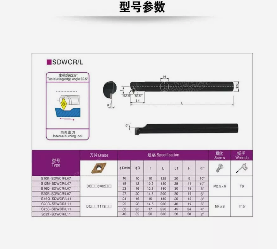 Model: S16Q-SDWCR11 Cutting direction: the right hand Insert: DCMT11T3 Material: alloy steel Color: Black Package include: 1PC S16Q-SDWCR11 1PCS DCMT11T304 1pc wrenches